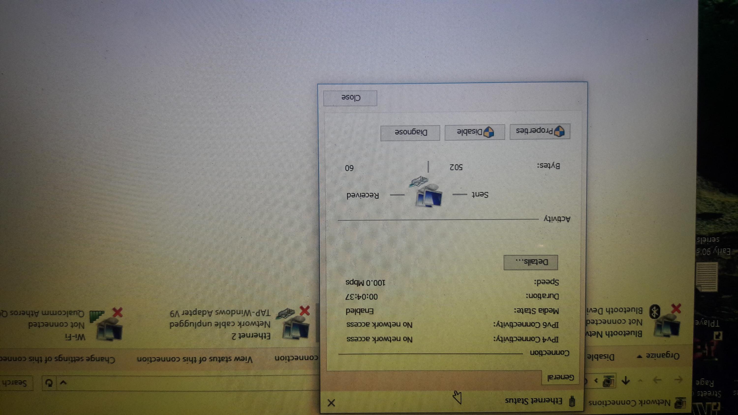 Now when I go to control panel, network and internet, network and sharing center, then click on change adapter settings, I get a active Ethernet port. When I open it, it says that IPv4 and IPv6 have “No internet access”. But at the bottom the activity chart shows some sent and received bytes and when I click diagnose I get the message that says –