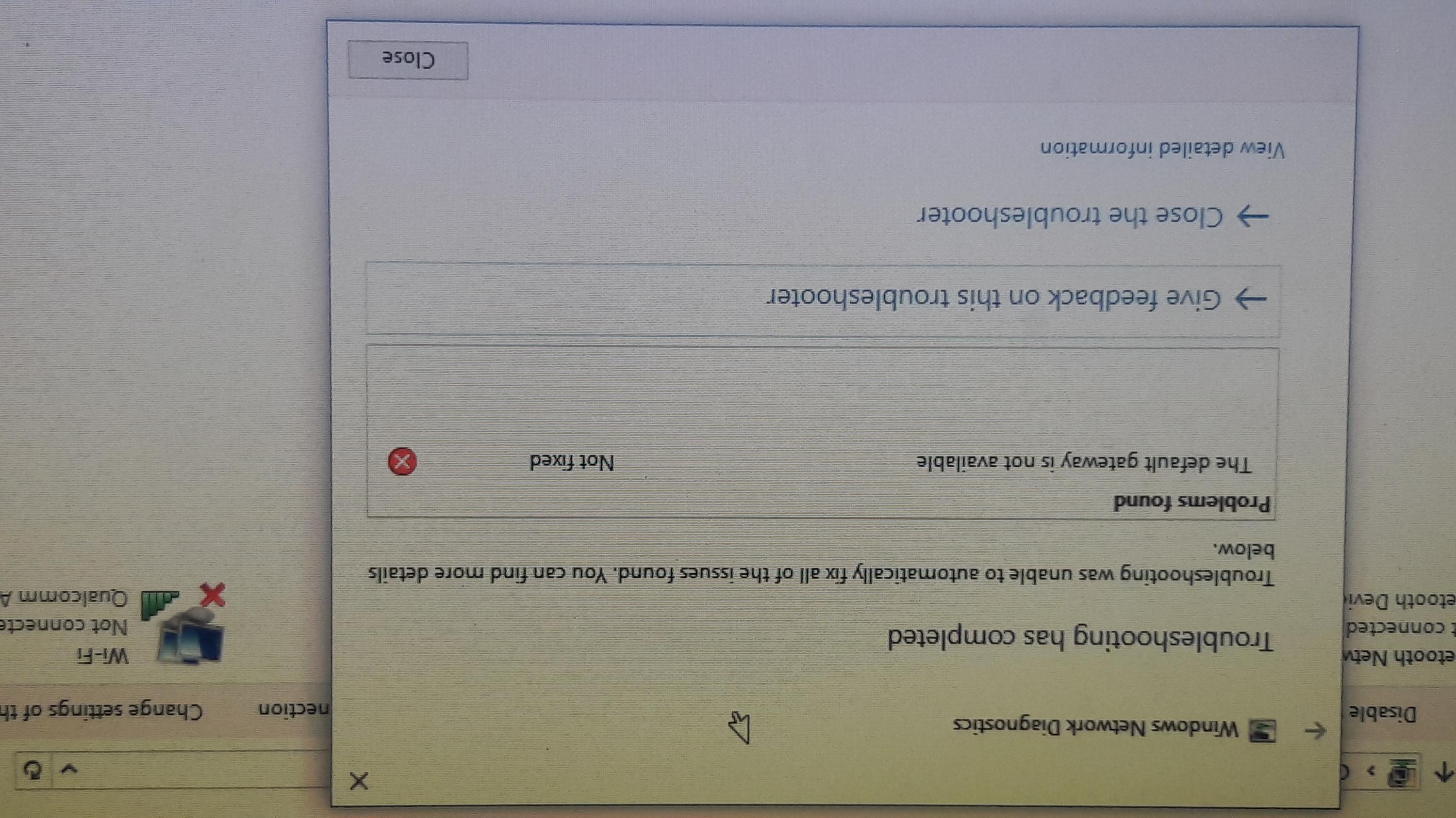 "Trouble shooting was unable to automatically fix all the issues found. The problems found are “ The default gateway is not available”.