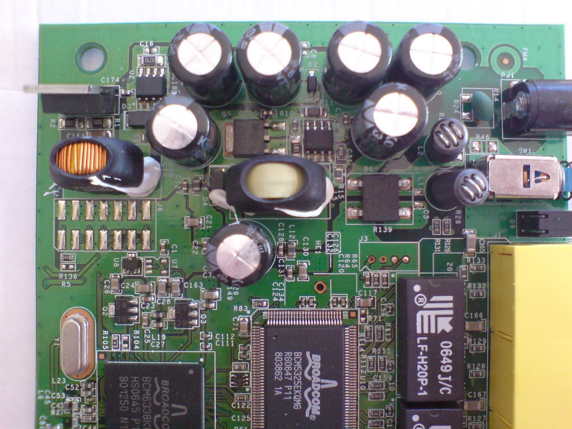 My speedtouch 546 has started playing up. I was getting lots of CRC errors on my line all of a sudden. This came a week after a Phone Line repair by BT. So I tried the router in the test socket to make sure it wasn't my extensions and the router began rebooting constantly. Fortunately I have a spare 546 that I got off ebay so swapped the routers. No problems with the spare and hardly any CRC errors on the line after 3 hours. Now the nature of line faults can be intermittant so will have to monitor for a bit but hoping this is the cause of my unstable line.A Saturday a few weeks back, my ADSL routermodem froze up completely (I've had short "hiccups" on the line for a while before that, but thought nothing about it), and as I bent over to to power cycle it, my eyes fell on the capacitors half visible through the vents. I thought two of them looked like bulging. After opening it up, I sure found two bulging Capxon 6.3v 1000uF KF-series. There were also five 35v 470uF of the same series that were not visibly bad. I pulled them, and the ESR was in the range 0.10 to 0.15. I decided to replace them also, but physical size (16 mm hight) would be a problem with almost all 35v's of the same capacitance. I measured the voltage across them, and that was a little over 24v. I therefore replace the five 35v with 25v 470uF Panasonic FMs, and the two 6.3v's with 6.3v 1000uF Rubycon MBZ'. The result; not a single "hiccup" or freeze since the recap. The unit wasn't more than about 20 months old when I recaped it. Before and after pictures enclosed. The quality isn't great, as they are from my mobile phone camera.