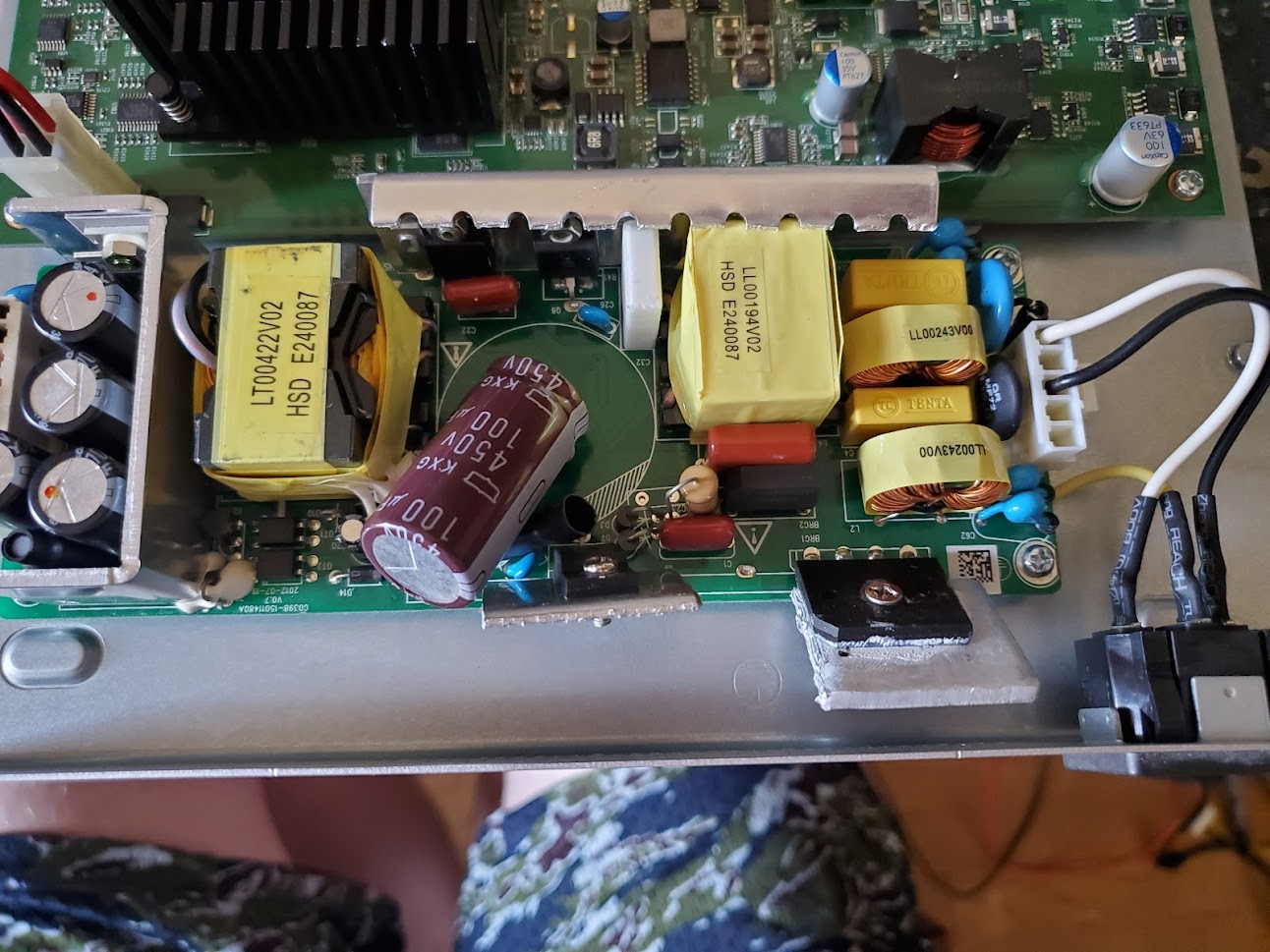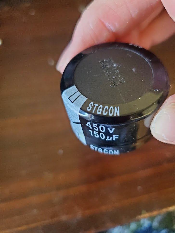 This thing is a huge pain to work on, but eventually I was able to remove the heatsink. Once I removed the heatsink, it was apparent the primary capacitor, a generic Chinese "STGCON" 450V/150uF, was bulged on top. other folks online had other components fail on theirs but the root cause may well have been the failure of this junk capacitor. It's a bummer because the rest of the caps on the PSU are Rubycon!