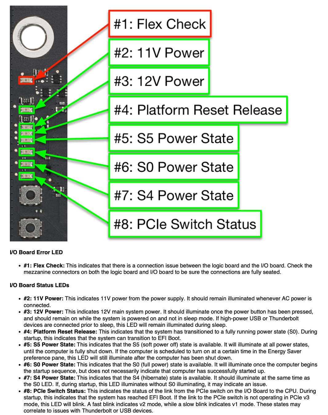 After a little scurrying on the web I came across the Mac's official service manual along with a few threads on how you could use the built-in LEDs on the I/O board to troubleshoot some issues.