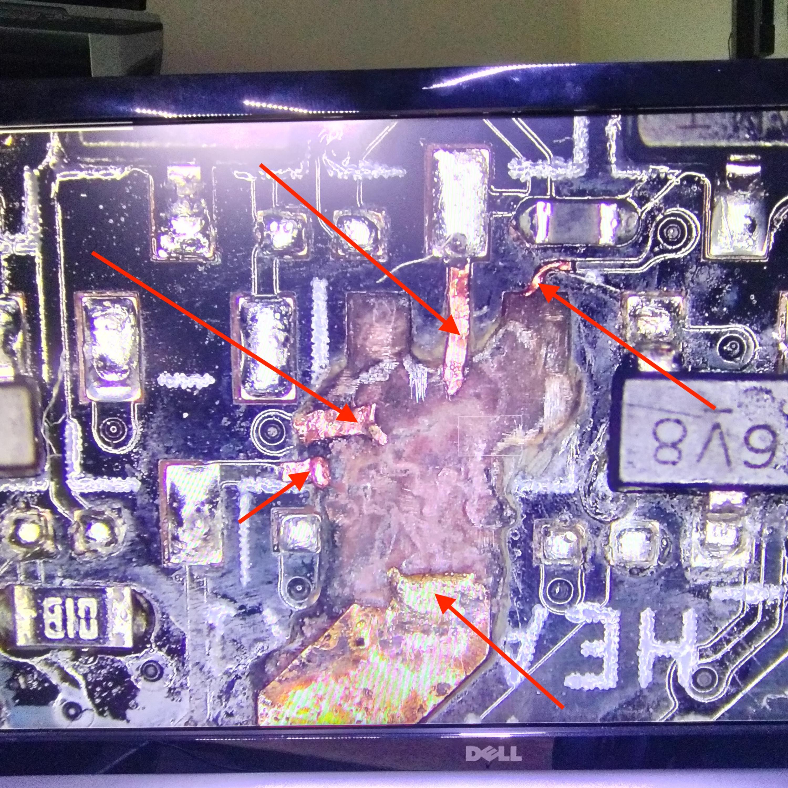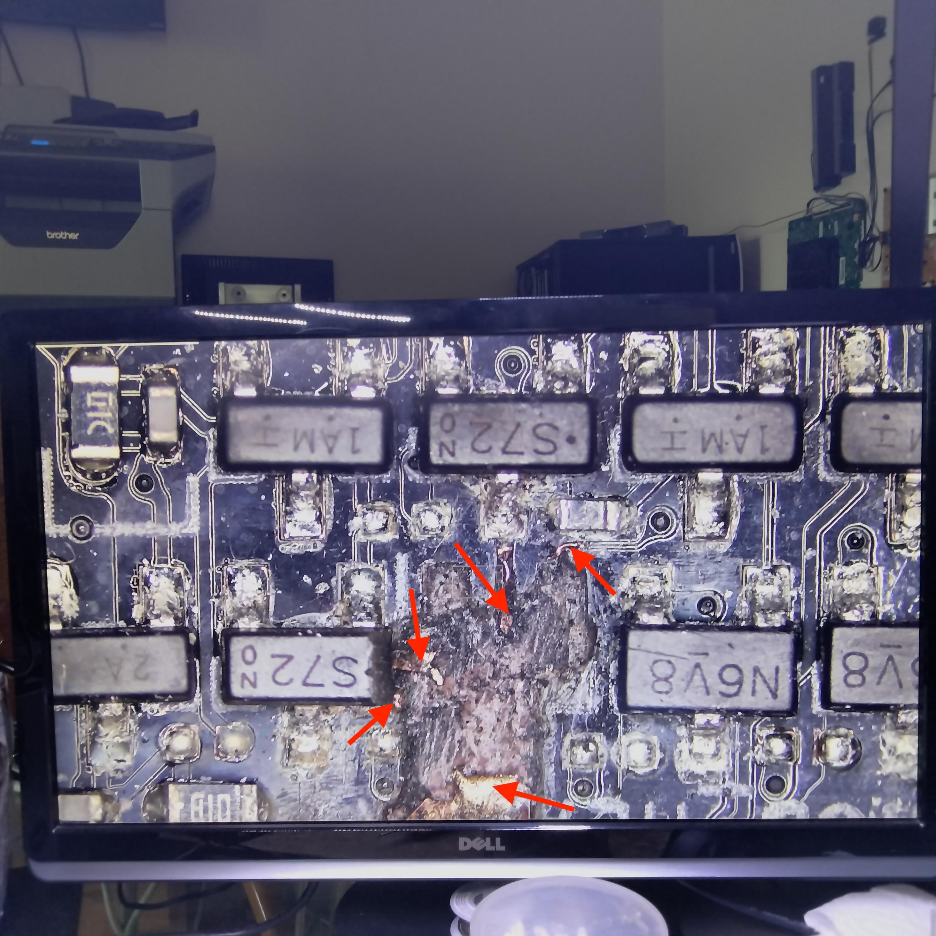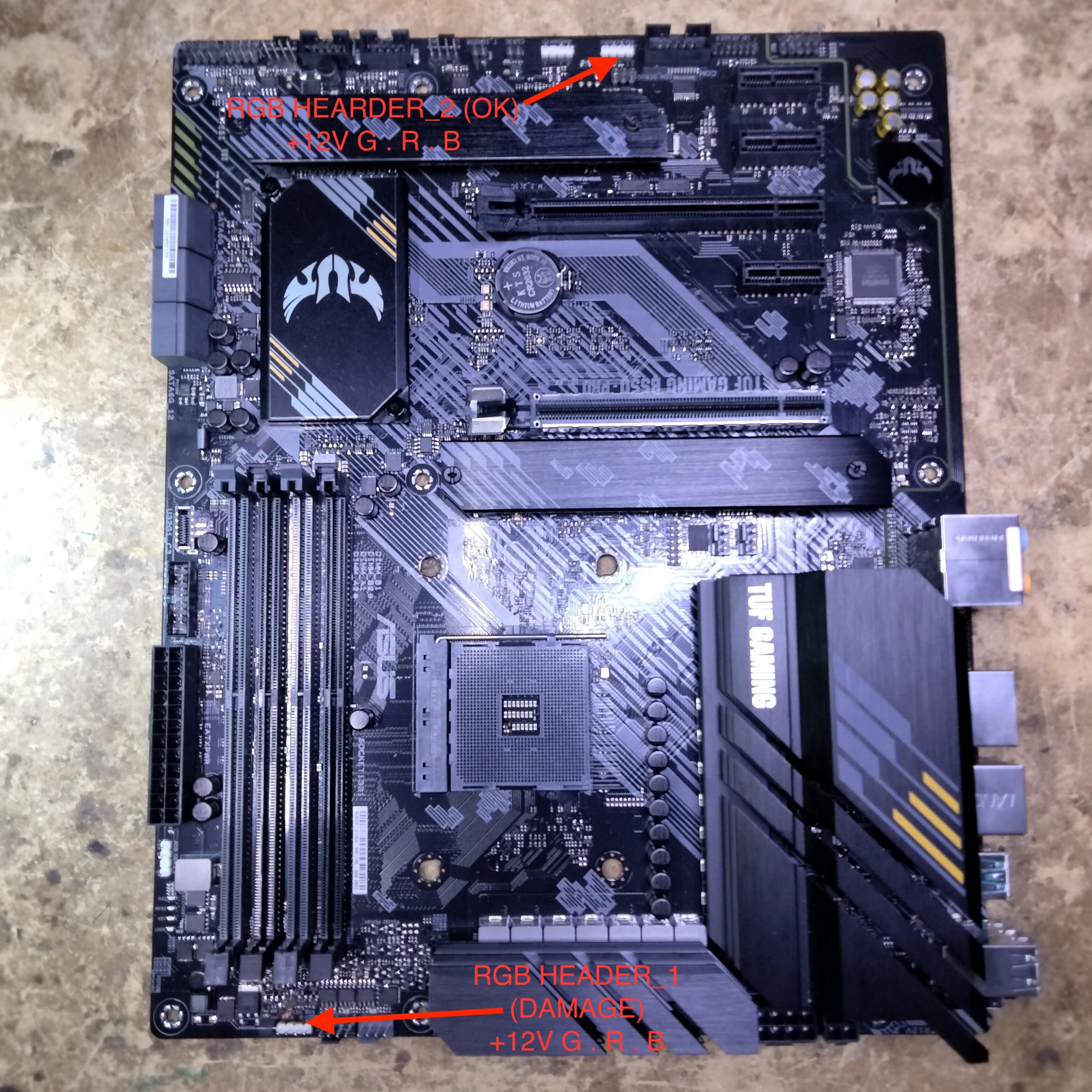 Motherboard - (TUF GAMING B550-PRO) client connected Floppy Drive 4-Pin Power Connector to RGB_Header_1 +12V G . R . B and Burn one N6V8 and Damage all circuit trace, please check pictures, Motherboard not turning on & everything check ok, no short to ground, I need to repair all circuit trace and replace burn N6V8 but don't know where this 5 circuit trace connect to N6V8. If anyone with TUF GAMING B550-PRO can check. “Thank you in advance”