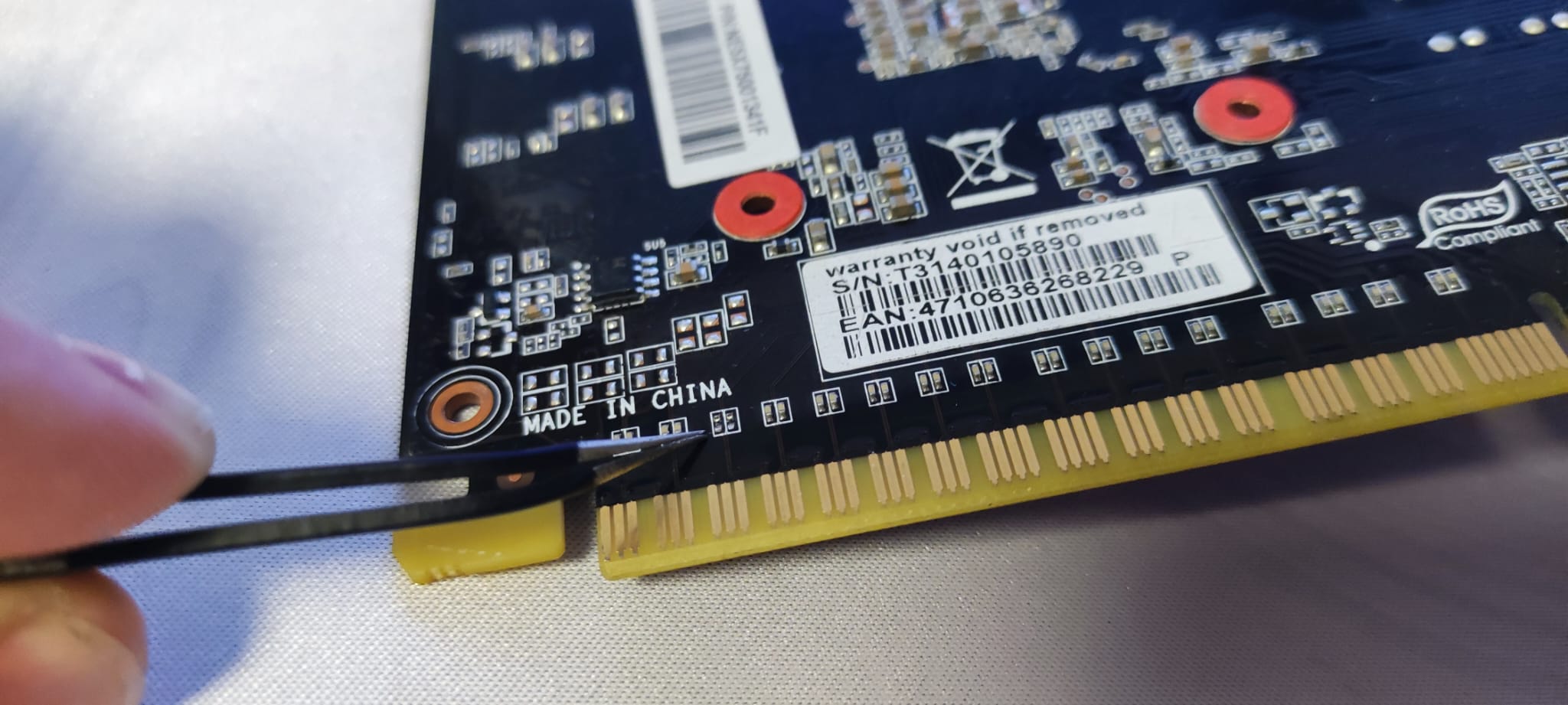 I have a Palit GTX 750 StormX with 2 gigs. on the backside right above the pcie connectors there are multiple conponents (See in the pics). I suppose those are resistors or capacitors. 2 of them broke of and now I need 2 replacements. I looked arround for some schematics but couldn´t find any. Someone have an idea how to identify those?