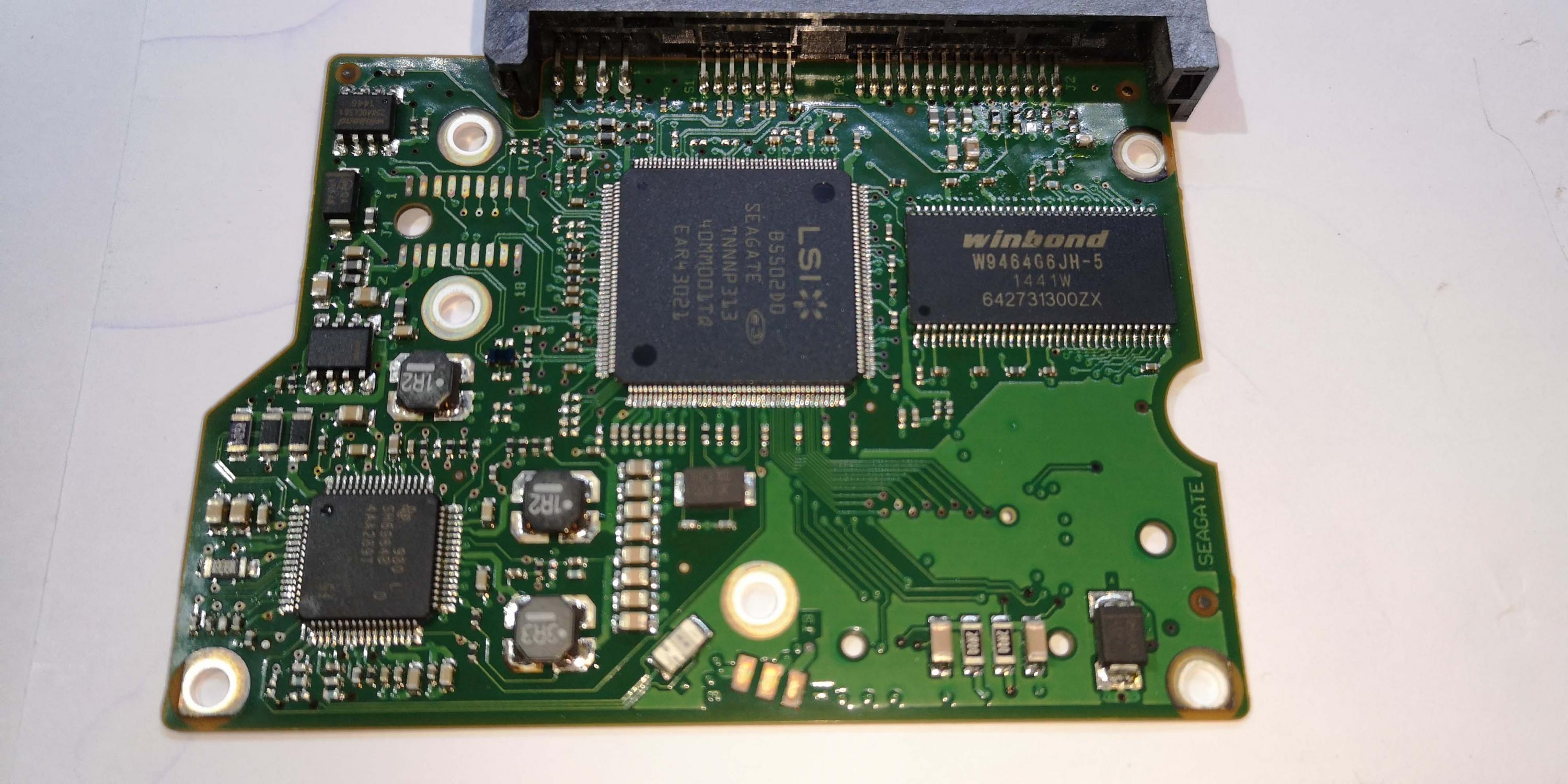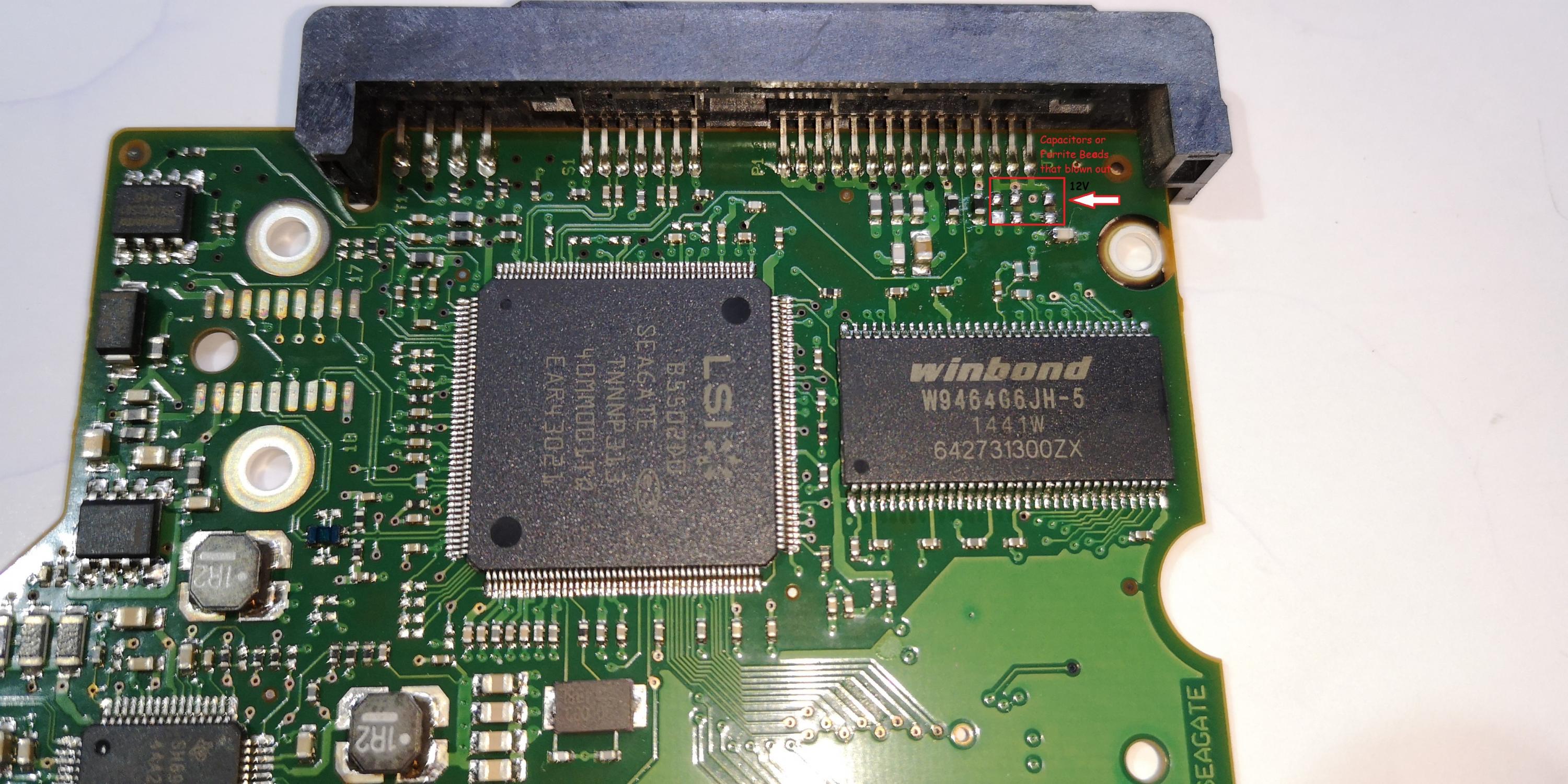 I have a Seagate ST3500312CS where is dead because overvoltage of the power supply. When I unscrew the PCB I saw that three capacitors (or maybe ferrite beads) where blown out. Do you have any idea if I have a possibillity to fix it. The problem is that I have an industrial custom PC where recognizes only the disk with the certain only firmware (it is crazy but it is true). Does anyone knows where the firmware of the disk is saved (I have another segate disk but with different firmware and I thought If I could replace the firmware chip in the good one). Anyway I would like to fix it (always there is something new to know in repairs), so there is any schematic of HDDs or what to suggest me to check it will be very helpful?