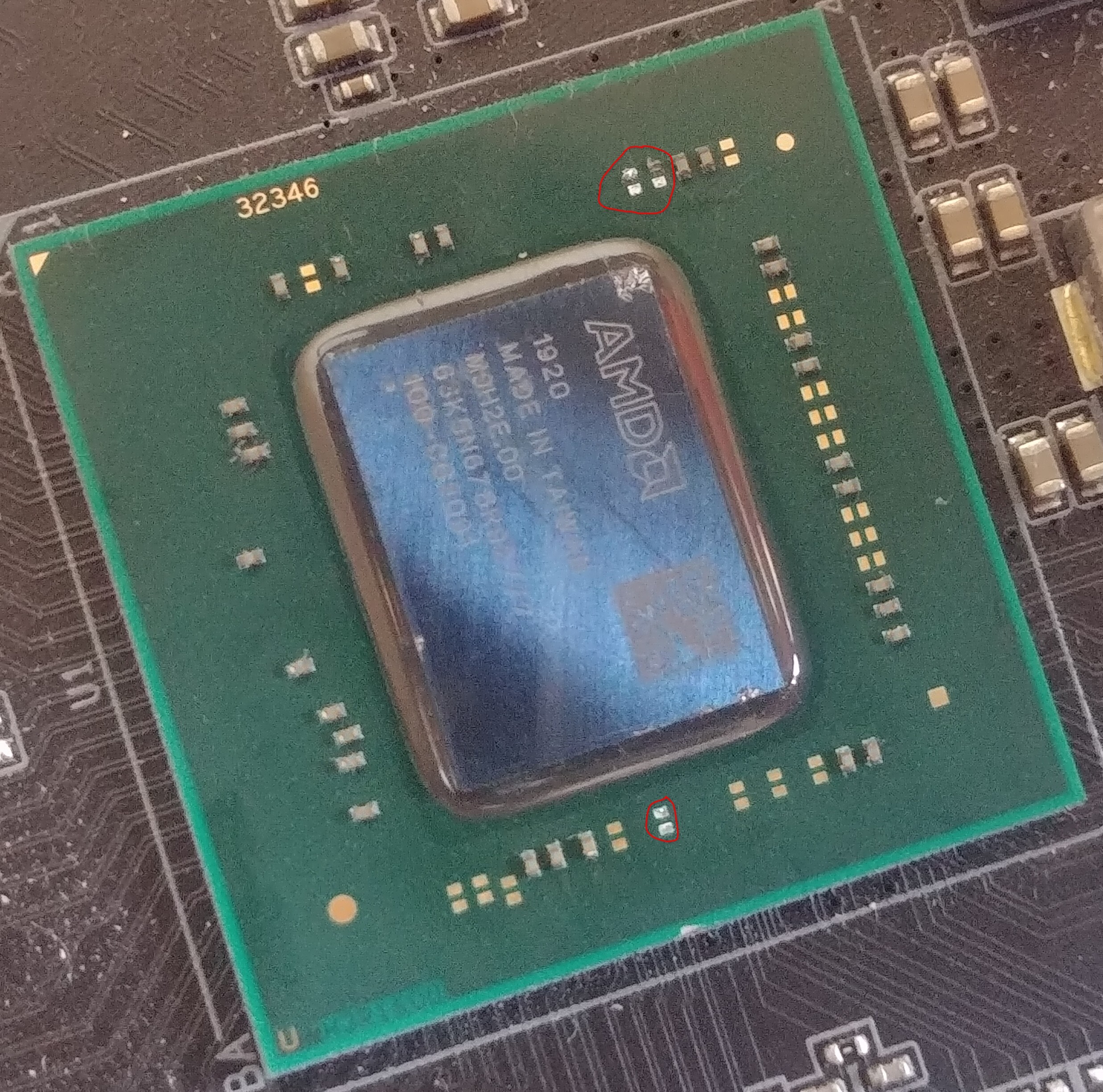 Done some more poking with this. The power rails seem OK, VCORE is at 800mV. APU_PWOK is fluctuating though, because PM_PWRGD is fluctuating. It looks like this is the chipsets power good signal? I've closely inspected it and it looks like at some point there were 3 components that were ripped off the green PCB that the chipset is on. Is anyone able to identify them please? I am wondering if they are preventing the chipset from powering up properly. I've attached a photo and have circled the missing components. It looks like it took a good beating from someone fumbling around with the heatsink for it.