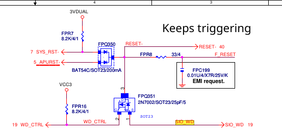 When the board has power but is not turned on, the reset line is high. When the power button is pressed, this drops to 0V with spikes to 3.3V. I'm not sure if this is because the IT8795E is holding it low after the board is turned on which could the the source of the fluctuating S3 and S5 signals, or if this is just another symptom of something else. I was trying to think of reasons why the S3 and S5 signals would be choppy and with my very limited experience, as these signals are so early on in the boot process, it is probably the processor beimg reset (either from a faulty CPU power supply (I'm not sure which one powere this part of the CPU) or from a reset lime going low). I tried disconnecting the third pin of FPQ350 but that didn't work, the board would power on briefly and then turn off.