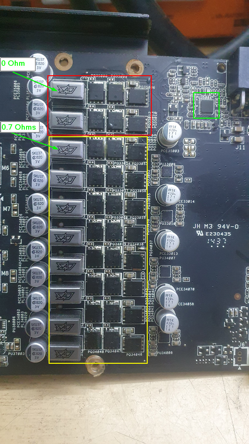 Hi I had this card not work, not found short on high side fets,gpu core 0v8 present but not have pover 2 coils that are in same row withbthis,not know if they are for memory power or else. As I see fets gate are driving by uP1631p. 5v vcc is present on driver, 1v2 enqble pin also present but no pulses to gates.