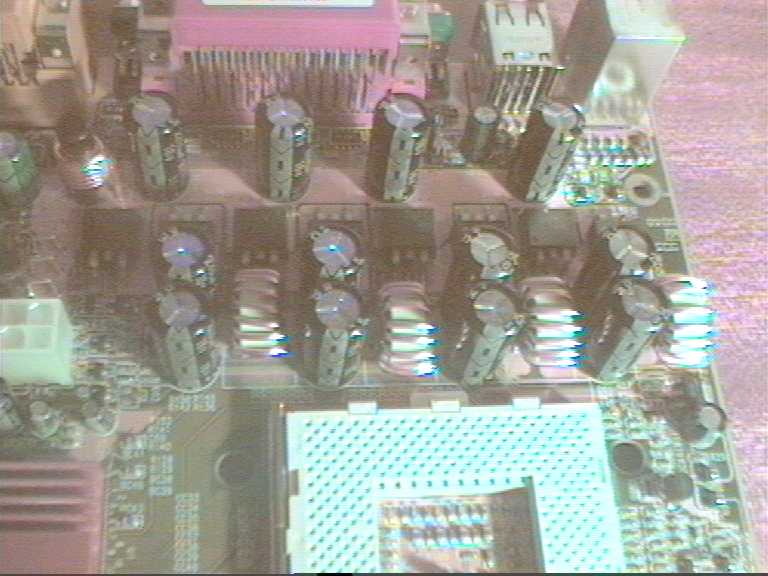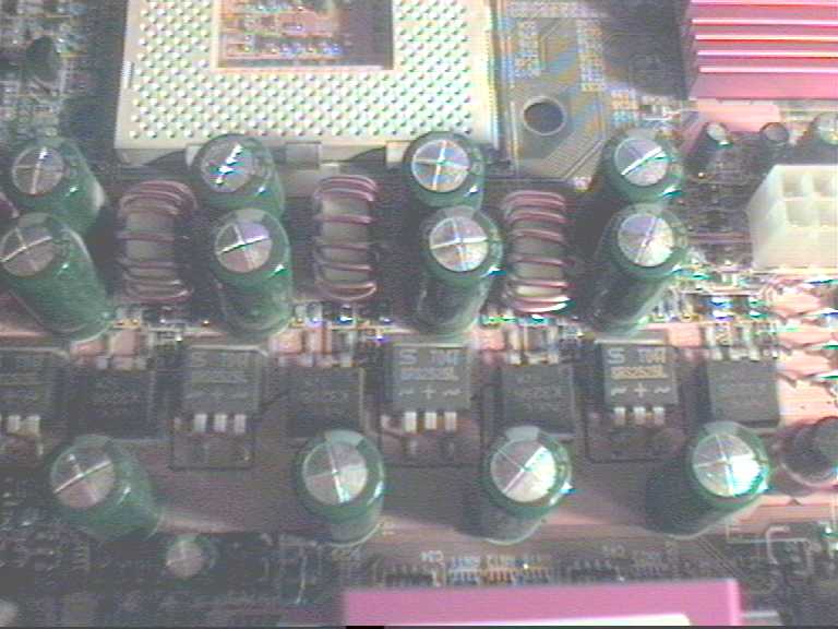 The bad caps are G-Luxons - this type fails on many ECS/PC Chips boards. No MOSFET damage. The board is now recapped and works fine (no photos yet).