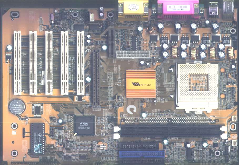 This is ECS K7VZA/PC Chips M807 board version 1.0 (light PCB, non-A KT133). v3.0 has dark PCB and KT133A, although there are exceptions - dark boards with non-A KT133 north bridges marked as PCB 1.0.