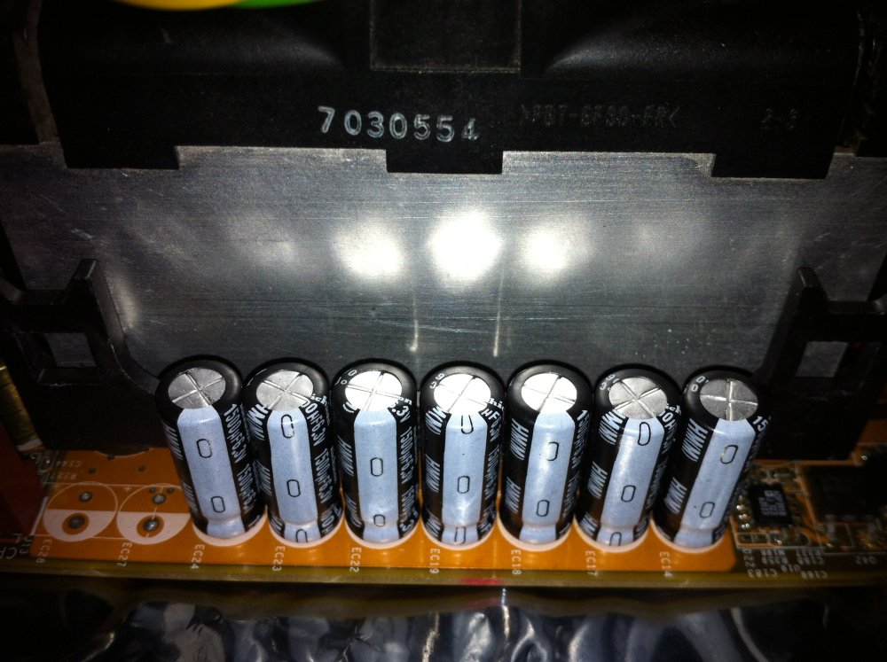 Replaced these two caps (this picture shows a temporary used replacement fan, and this was before I hit it with some compressed air, my apologies.) Prior to replacement, these particular caps were severely failing ESR test, and were obviously swollen. From what I've read, it seems that these video card caps and the bad caps on the motherboard were contributing to higher load/resistance on the 3.3v lines causing the heat issue at the ATX header.