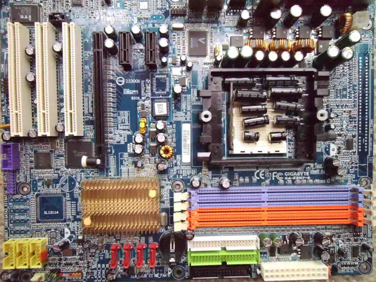 Was given this GA-K8NF-9 because of the swollen capacitors - three of four 3300uf HM in the VRM, and both 1000uf HM beside the white IDE connector
