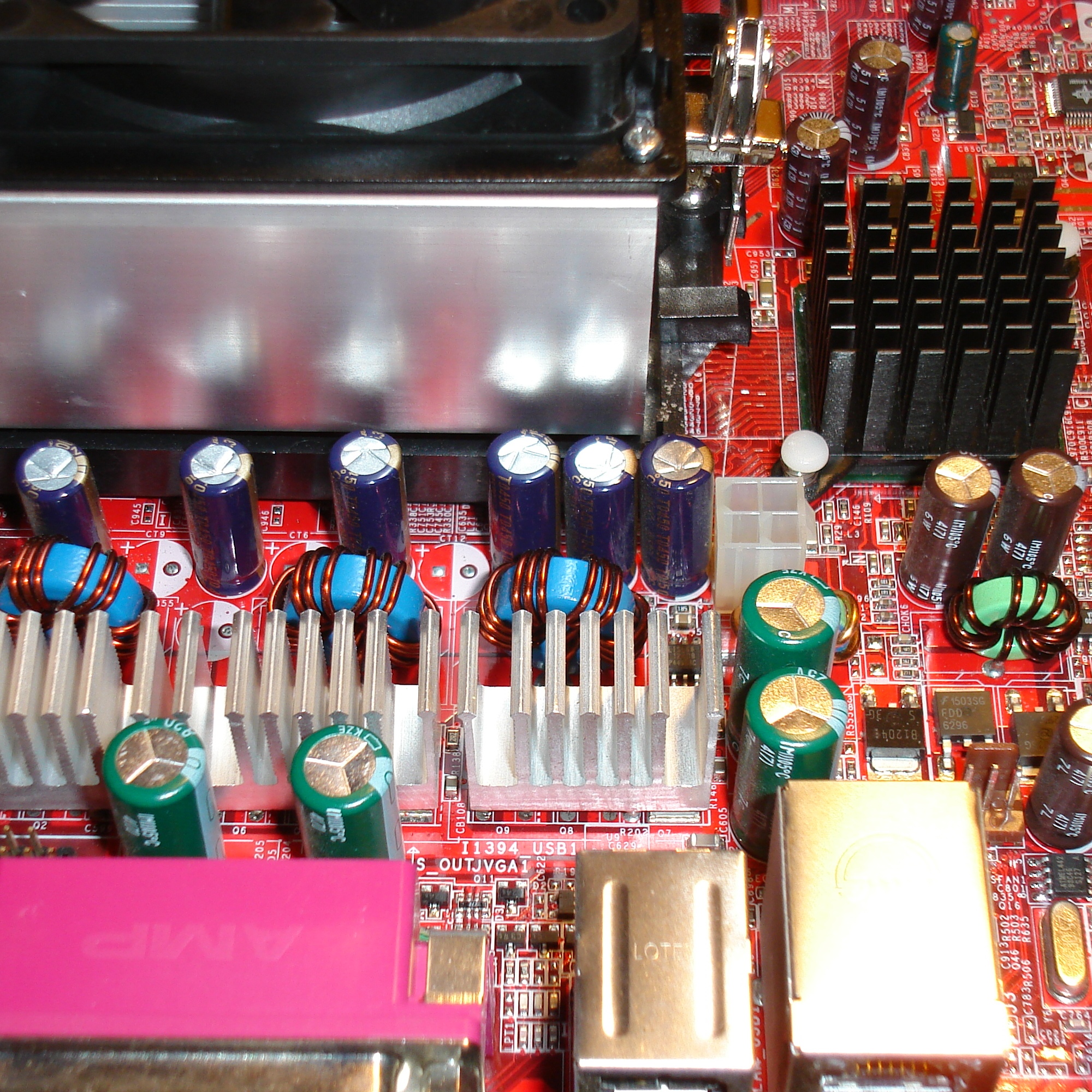 There are Green 25V 820u KZE, Brown 6.3V 1800u and 16V 1000u KZG about, but right next to the CPU are Blue 6.3V 1500u MBZ. All 105C.
