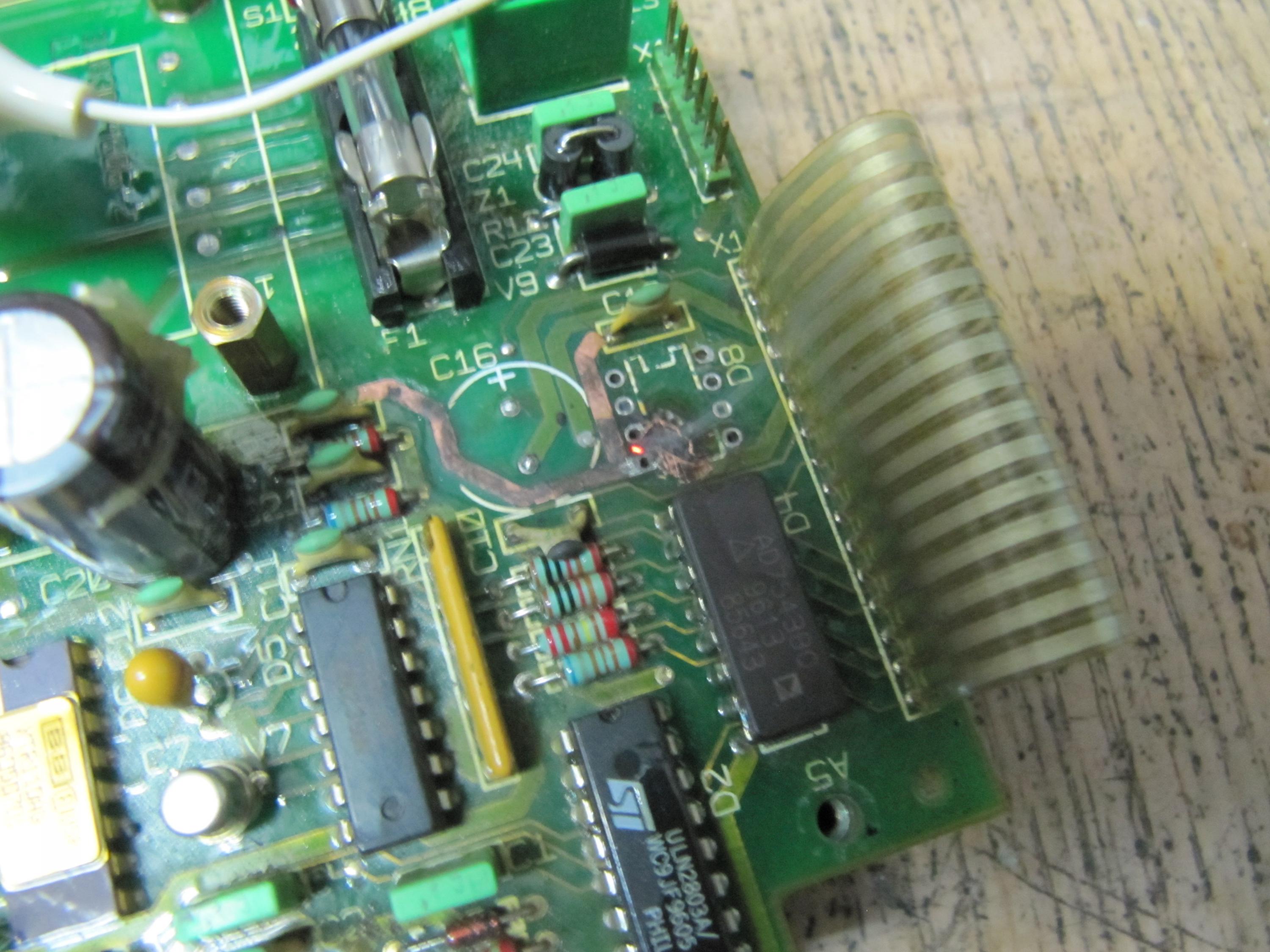 Here is a pcb on fire, because a capacitor leaked.