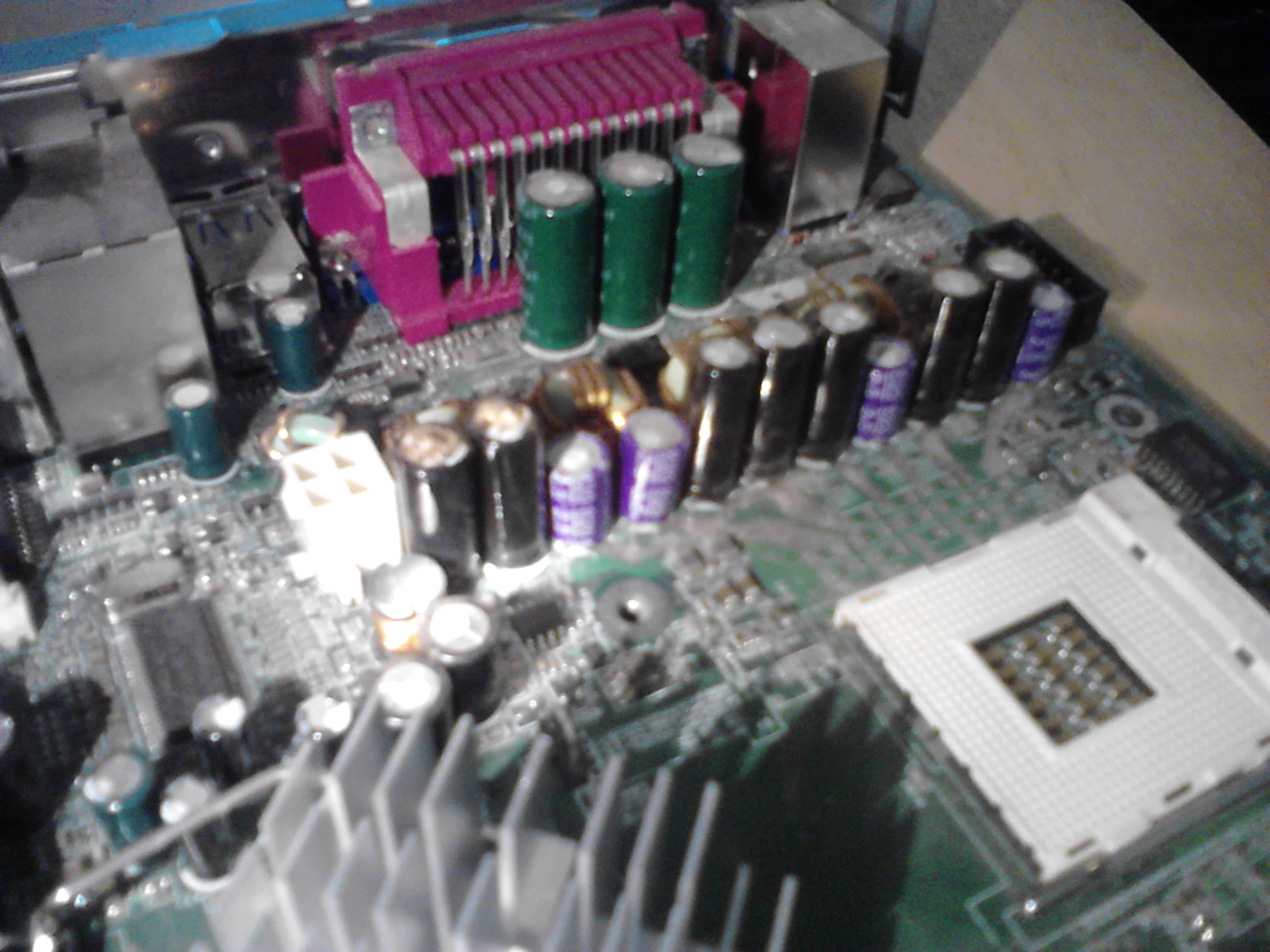 and a solid cap that looks like it was leaking on the top or another cap got its juices on it, the mobo boots but no post, right now its kinda parted out