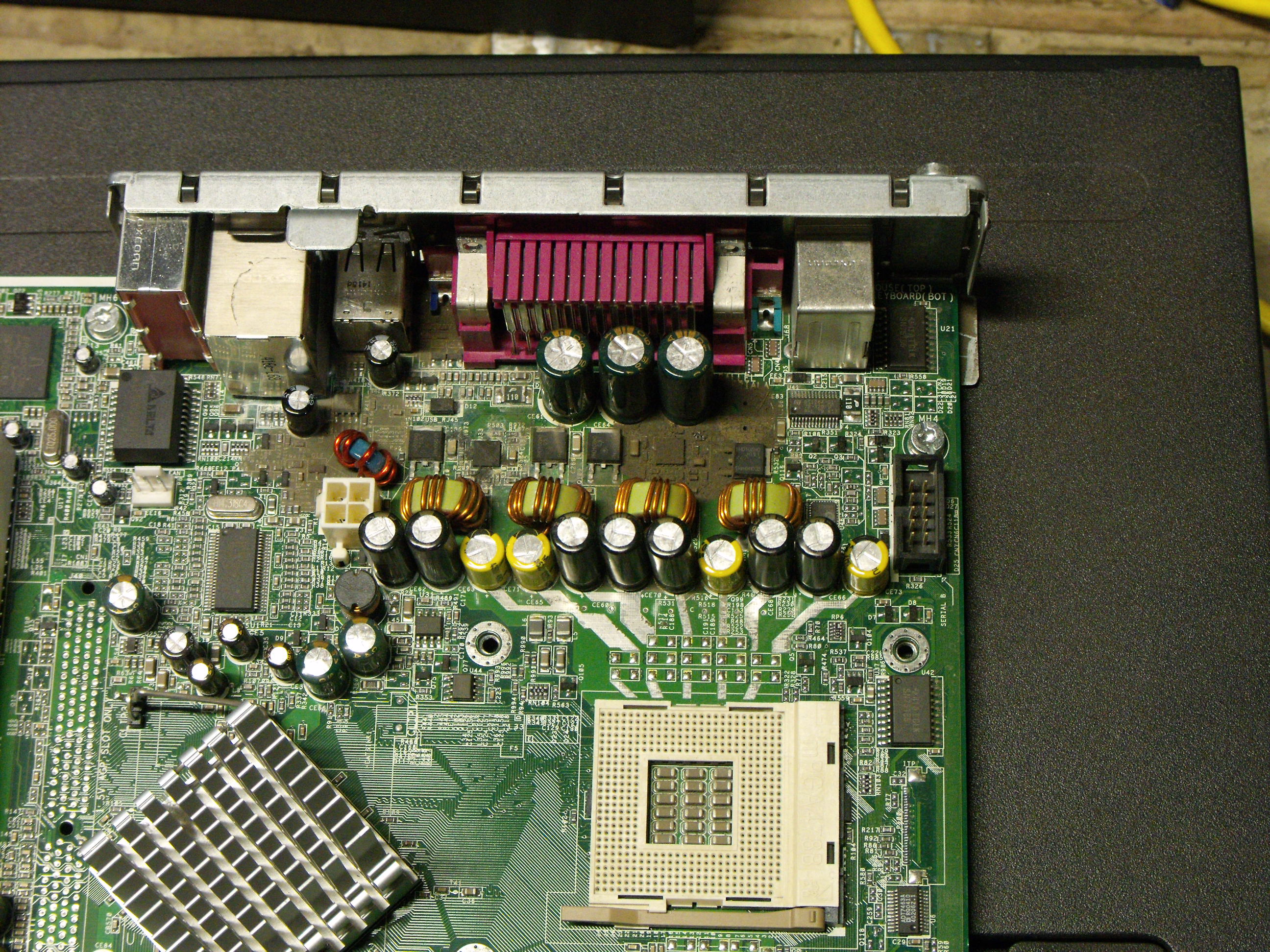 The pic of board above w/o processor is a dc5000, the only bulging caps are the Teapo SC 1000uf 6.3v near the heat sink. That's why I originally thought the wet appearance area was the problem. That board was pulled and replaced (w/ebay board) some time ago.