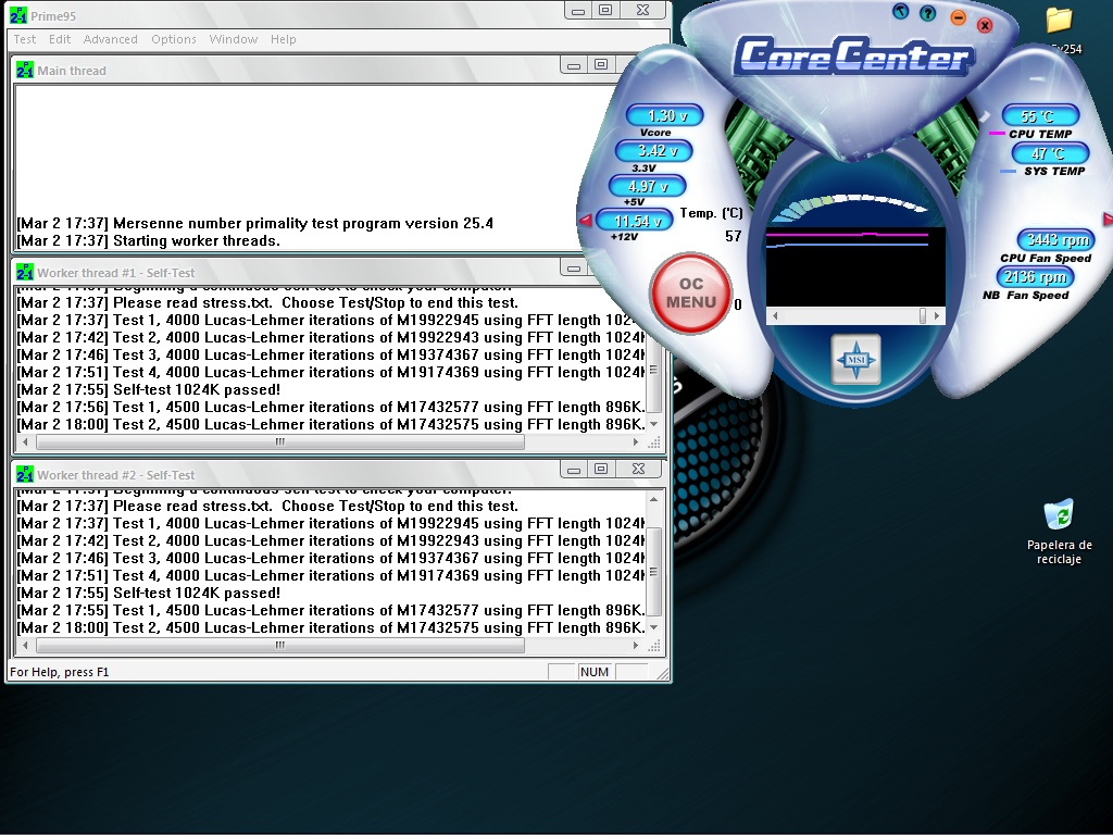 Core center shows CPU and 12V voltages unstable, but software readings are known to be very inaccurate, my dmm reads a steady 11.88V from 12V line under load and 12.00 in idle state as for the Vcore i could't take any readings because the test was made with motherboard inside a closed case to get realistic results, once i get new caps will do proper tests for Vcore if required.