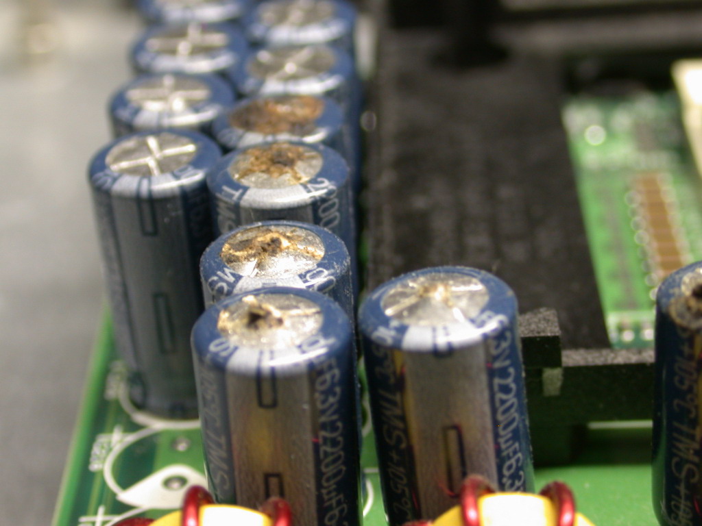 Just unpacked my eBay EVO, and thought I'd peek inside to vacuum out the dust bunnies, look for any shipping shake-out, etc. What I wasn't expecting was to find seven out of 13 leaky caps!