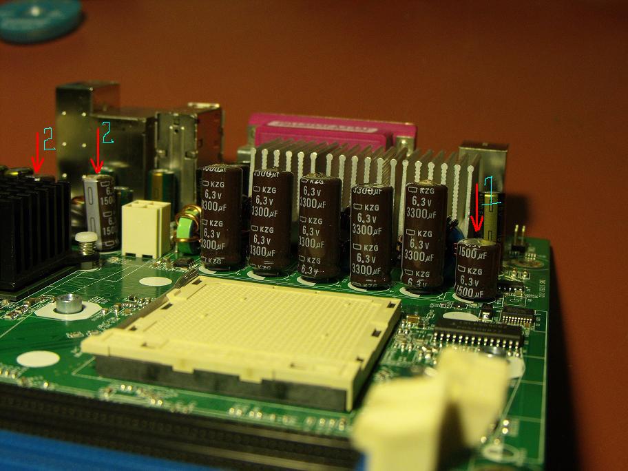 The board has two different size 6.3v 1500uf caps in the KZG series;