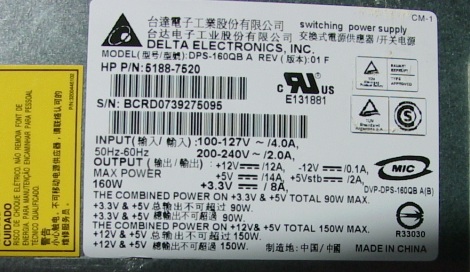 Delta Electronics P/N: DPS-160QB A Rev: 01 F