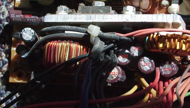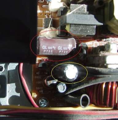 The 2nd was a 1000uf 10v (HD)(yellow oval). I did have a 1000uf 10v (HM), but I didn't substitute. (???) Old one looked good so I left it. (???)