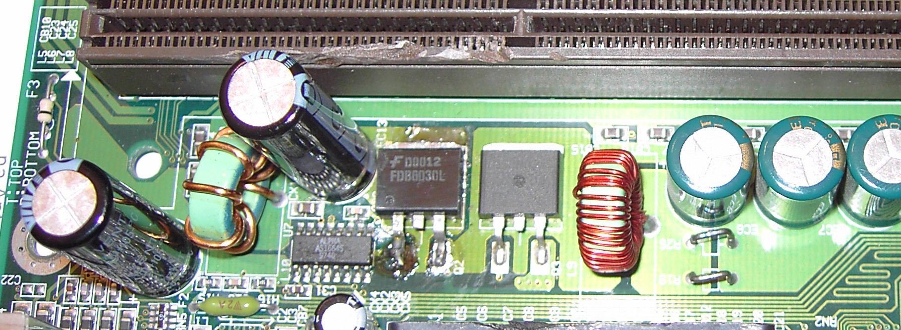 Since both MOSFETs have the same temperature under load, running P95 on a P3@600MHz, THEN I assume that the original MOSFET -- the D50N03A --, is also a Logic Level MOSFET (Correct me IF this assumption is somehow wrong!), maybe with 50A, 30V, like kc8adu had mentioned on a earlier post, but since he had not documented it's words, I don't know for sure some other relvant characteristics, like Rds(on), etc. But I'll assume that they are slighty "worst" than those of the Fairchild FDB6030L , since P2(Klamamth/Deschutes) current requirements are slightly lower than Katmai (P3) current requirements.