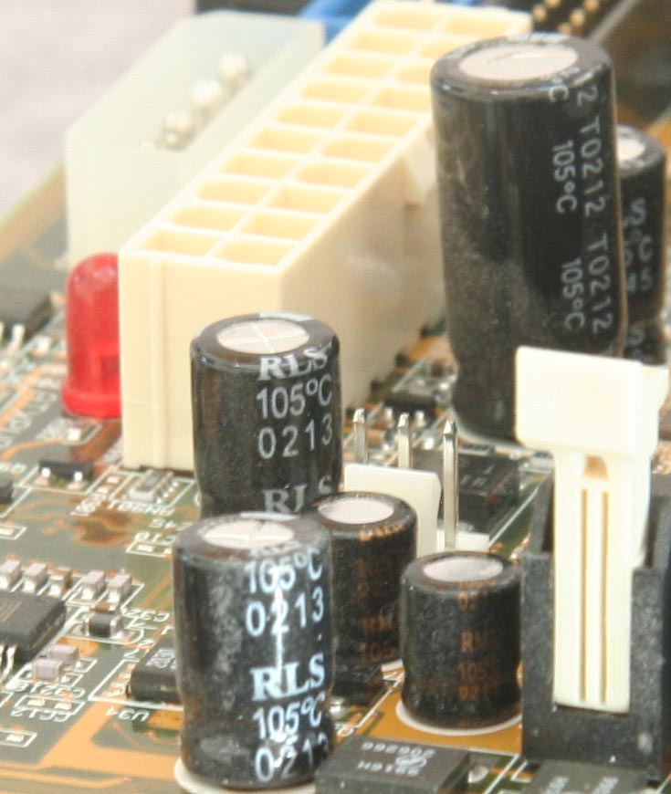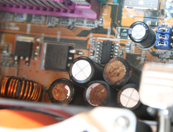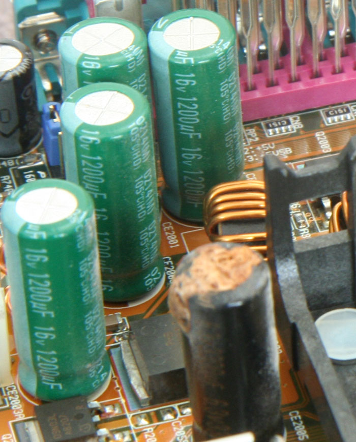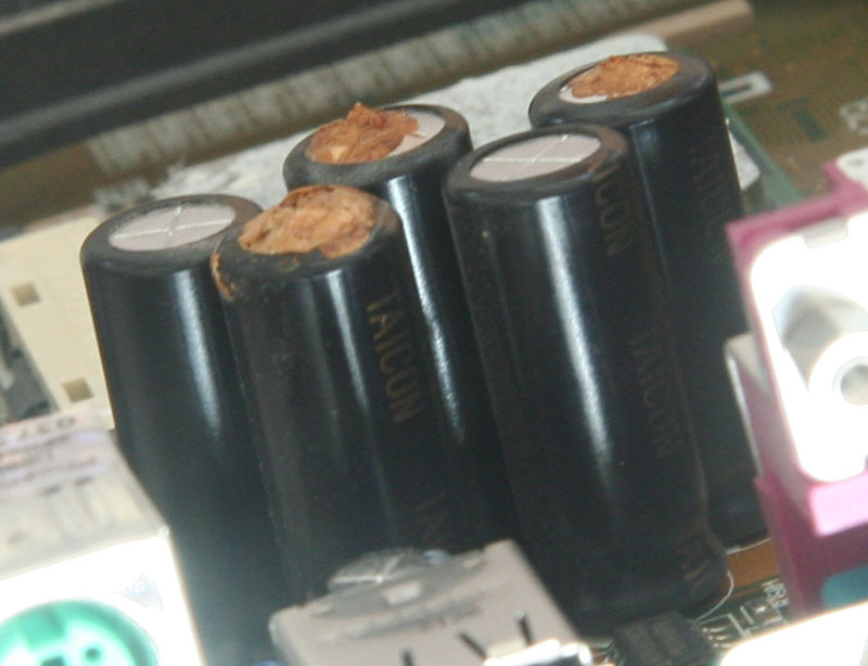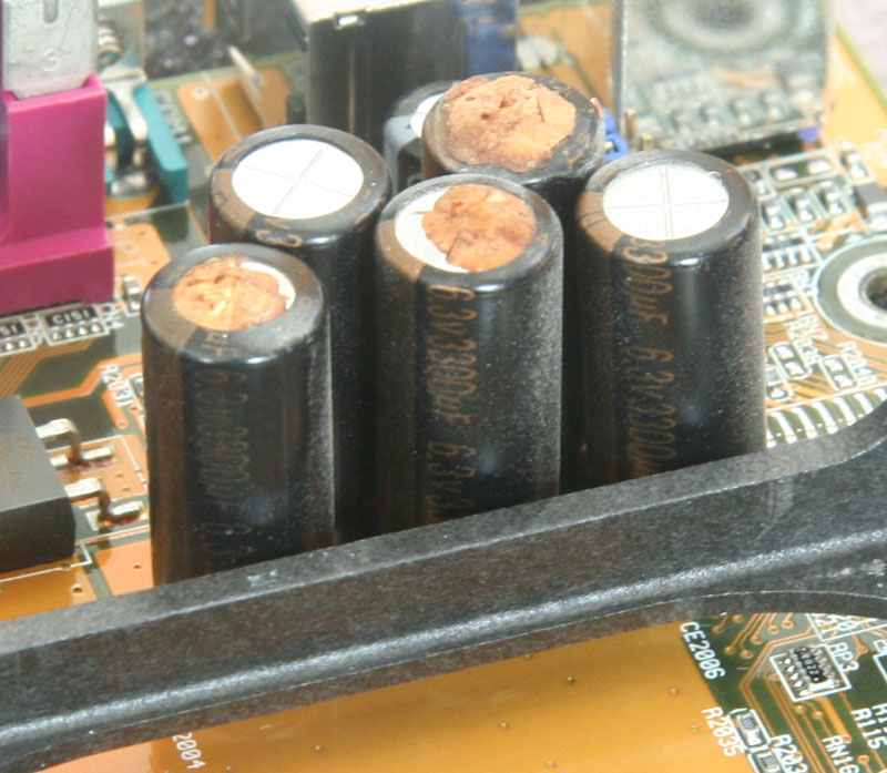 I built my current main PC in the summer of 2002. Recently I opened it to add a large hard drive, and noticed alarming "crud" on several capacitors next to the CPU.