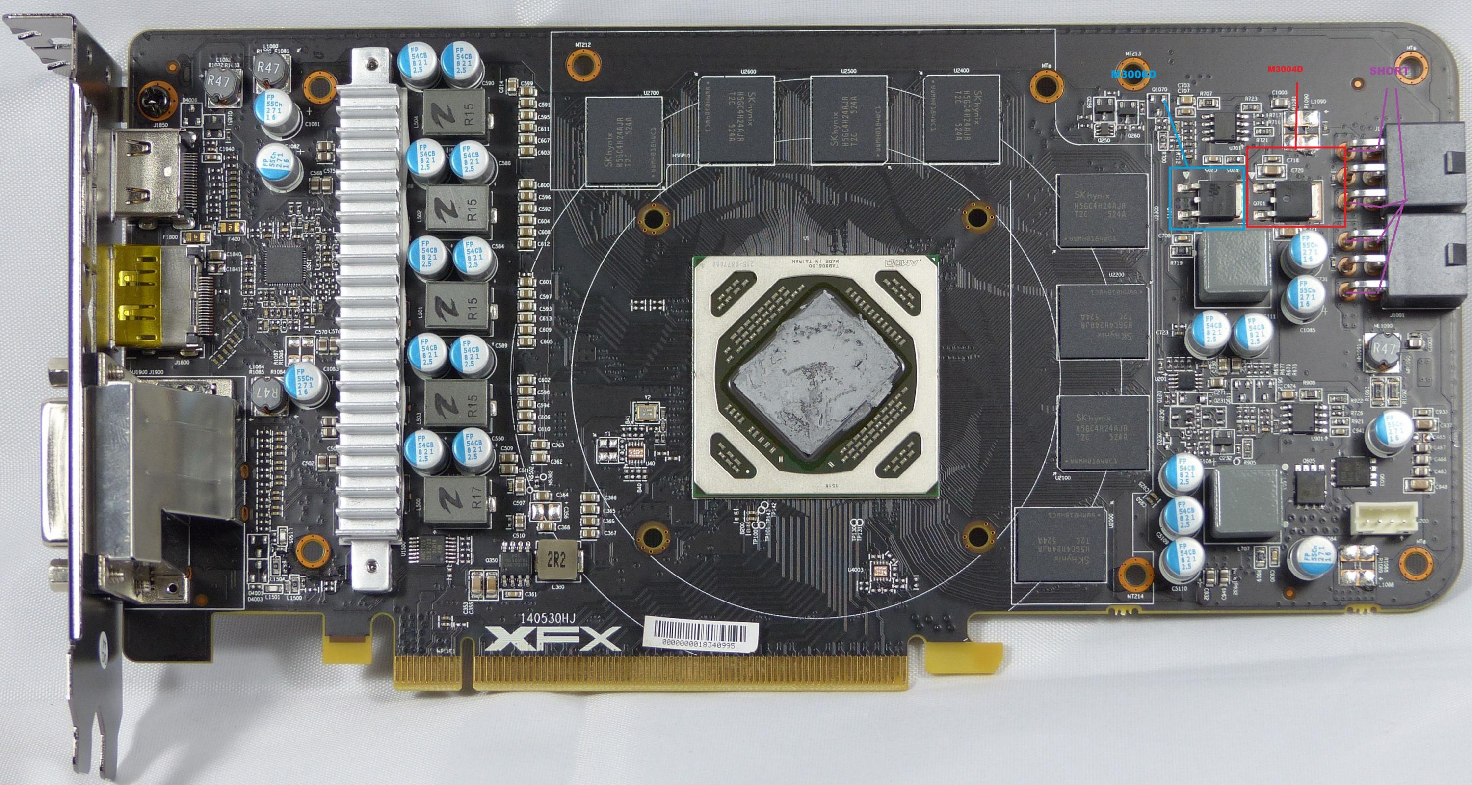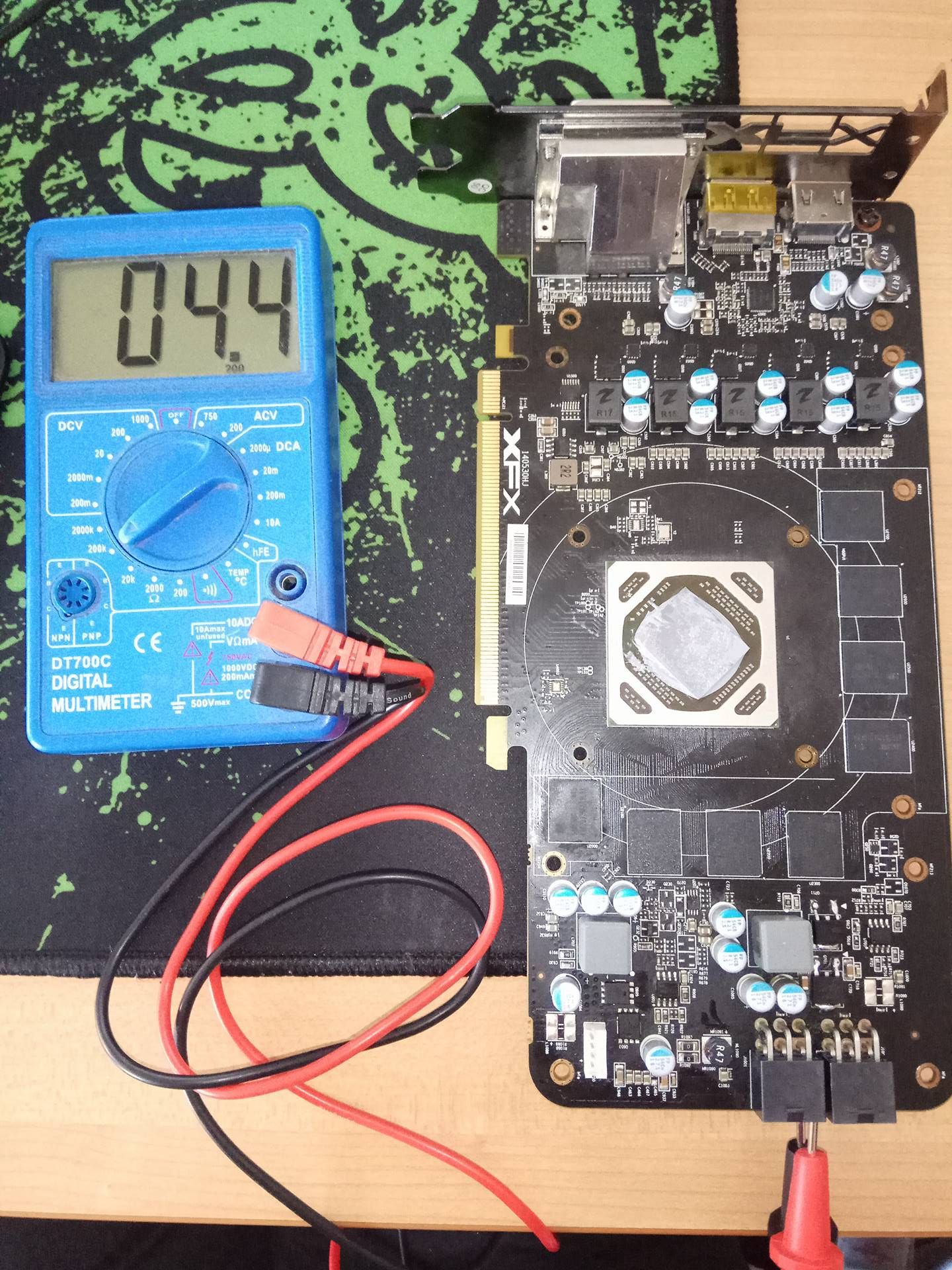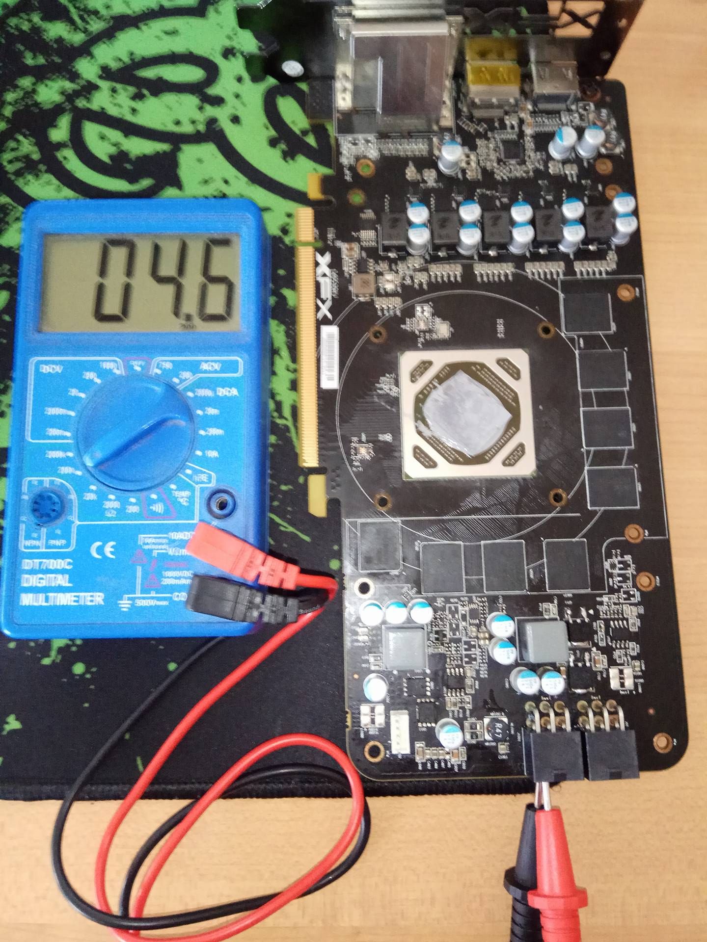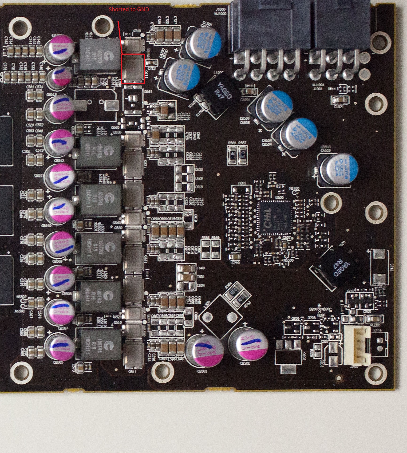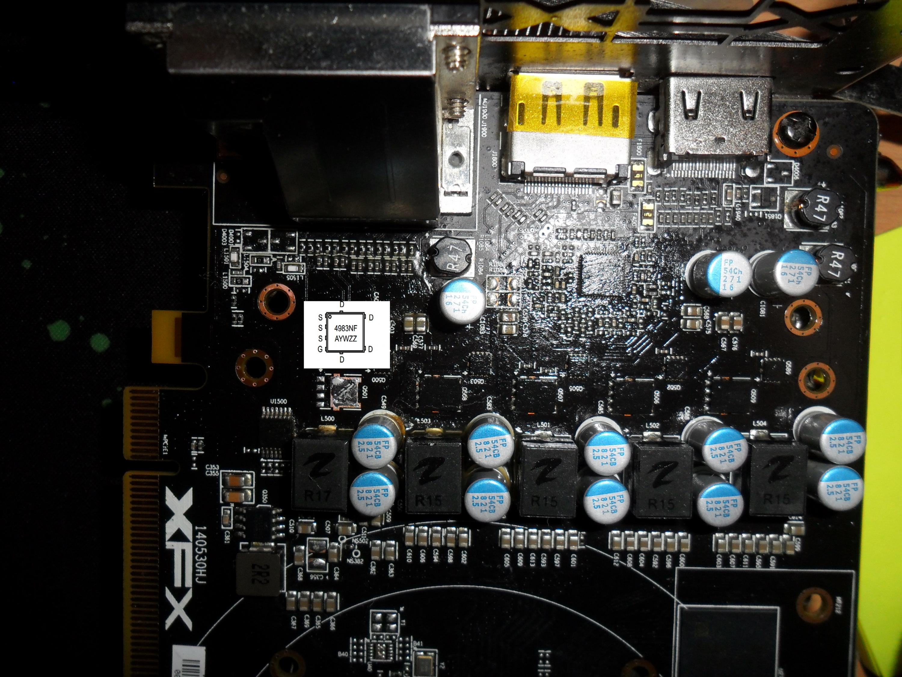 I tested everything else on the card and if somebody wants a picture about the shorted mosfet, well there it is. But the gpu memory mosfet itself could be just fine at the worst case of scenario. The short could be caused by GPU memory itself (atleast half the rams are dead) or the memory controller within the GPU die. I will solder the mosfet off and report back then. Let´s hope for the best. BTW that shorted mosfet is very very common AMD cards and most likely it is the faultty memory controller within the gpu die