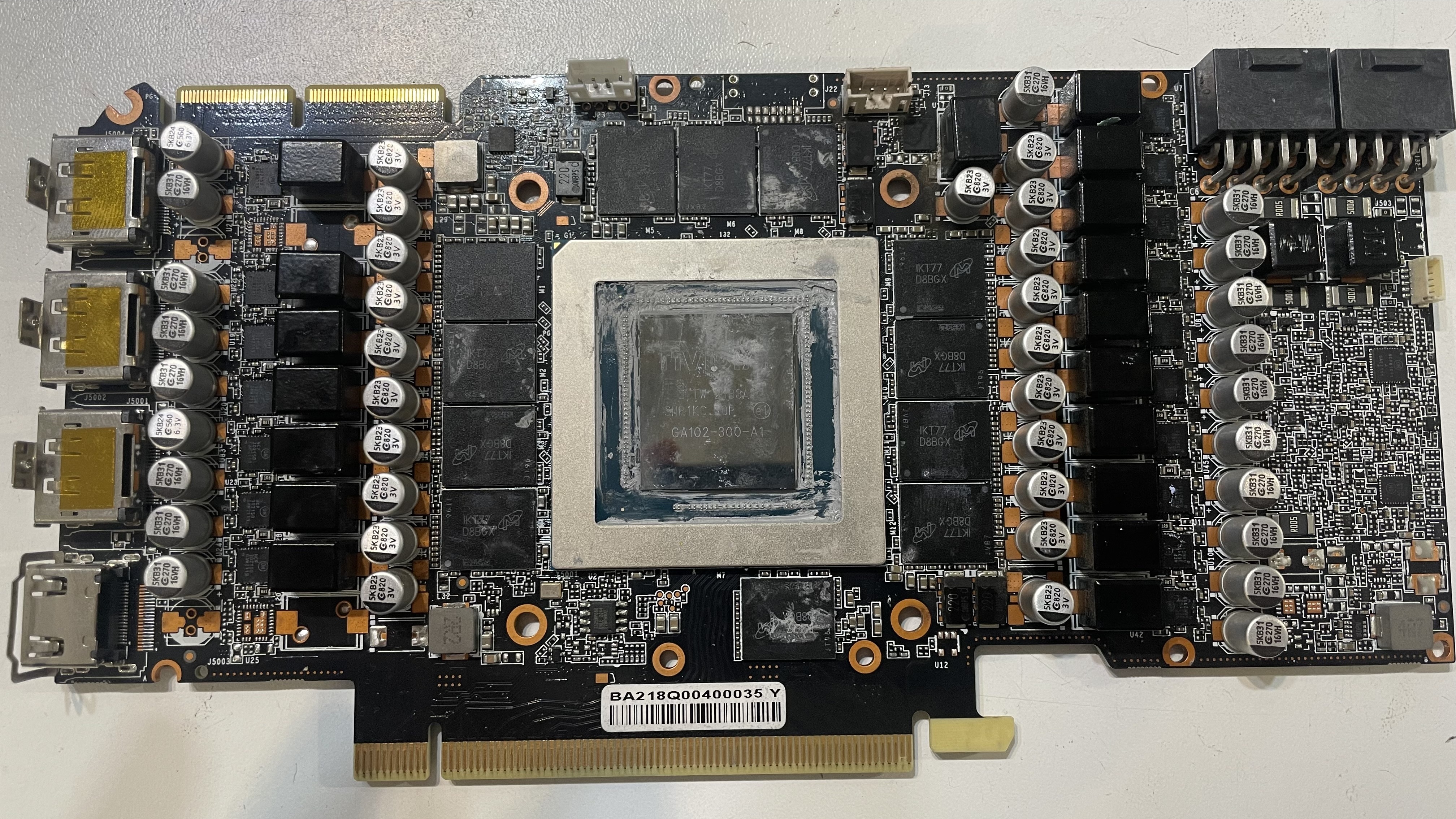 Hello guys. I have a problem with a PNY XLR8 GAMING RTX3090 graphics card. The problem is that it displays and works fine, but the fans don't spin at all. The problem occurred when someone else removed the fans in order to clean it and broke one of the fan connectors. He replaced it himself and after that, it wasn't working anymore. I guess he damaged something else in the process. What i have done so far: I found 2 capacitors next to the connector that were in a bad shape, he must have touched them with his tools - they weren't shorted, but i replaced them with similar ones from a similar card. No change. I tested the fans, separately, injecting voltage - they spin fine. I plugged in another fan from another card - it doesn't work. There are 2 connectors on the card and 2 of the fans are on one of them and the other fan is on the other connector. None of the fans spin. I measured voltages as follows: First - Without any fans plugged in and the card switched on with the computer switched on (displaying picture just fine) : PIN1 : 3,3V , PIN2: 1,8V, PIN3: 12V, PIN4 is ground. Second - With just one or both fans plugged and everything switched on, displaying picture just fine: PIN1 : 2,3V-3,3V fluctuating, PIN2 and PIN3: 0,6V-2V fluctuating, PIN4 is ground. If you check the fans speed on the computer it is saying that they are turning with 90%, then 95%, 97% etc... even though, they don't move at all. So i guess there is something wrong with the driver of those fans or something else but i don't know where to look for anymore and i can't find a schematic for this particular model. I have found for other RTX3090 but on them, i don't see the fan connectors and the design seems to be different. Does anyone have any ideas where i can look for the problem? I have uploaded pictures, the broken connector is the one on the left, upper side. Thanks a lot.