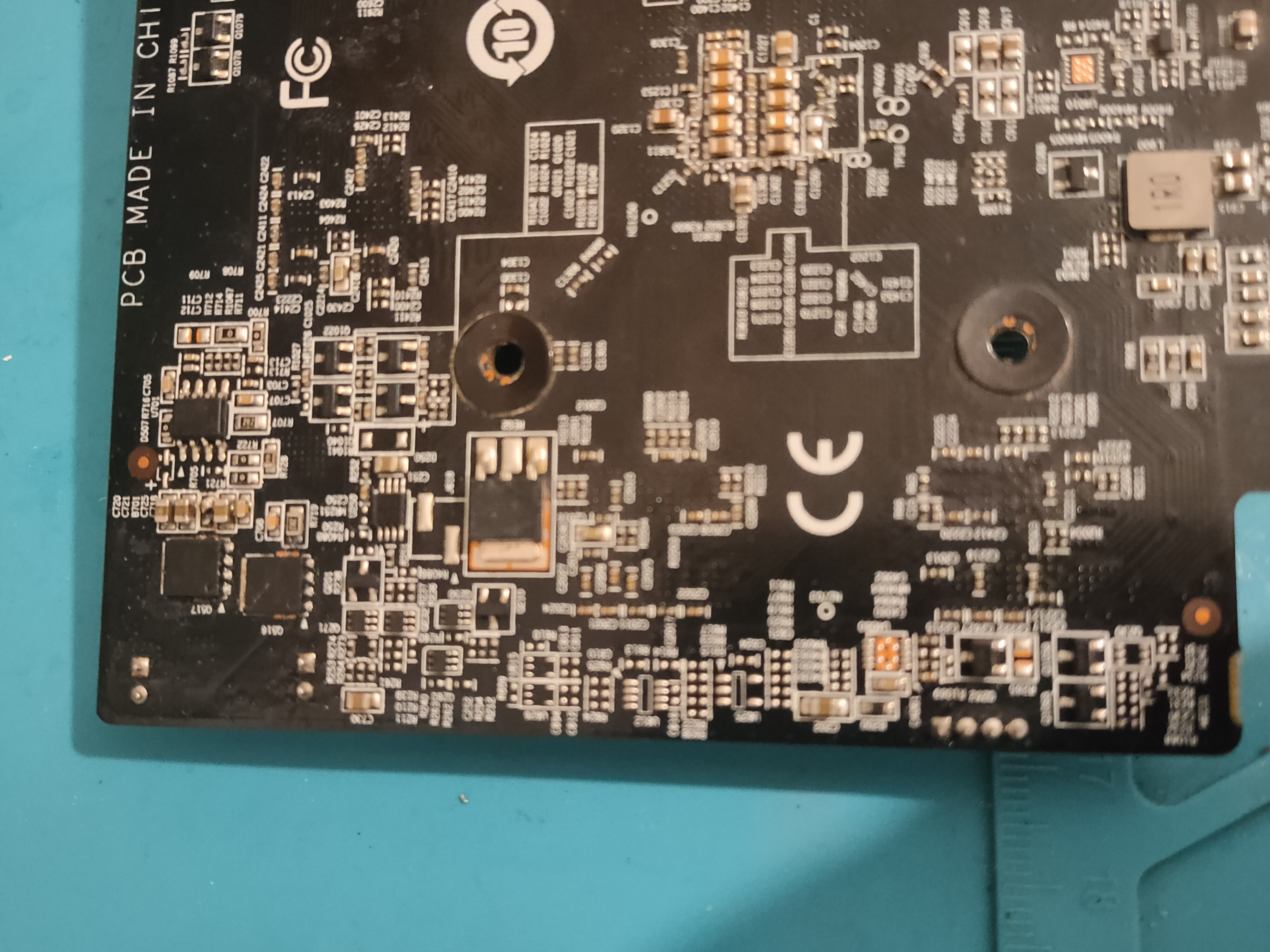 As shown there is a burned ferrite bead, next to a high/ low side VRM pair on the back side of the card
