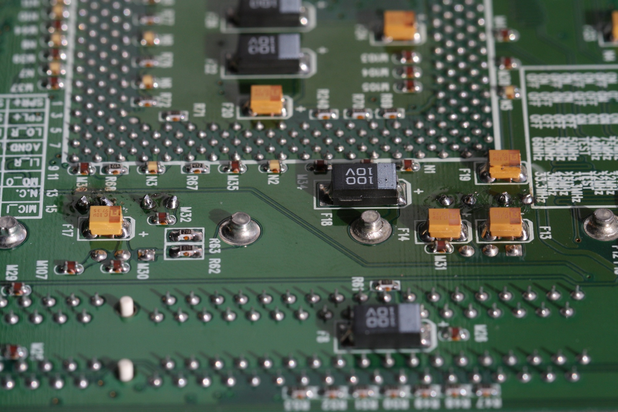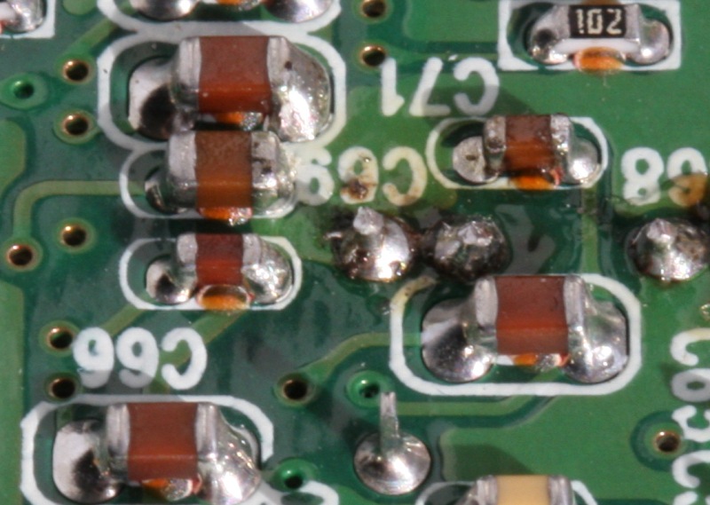And here is the backside of the same, you can see the caps legs in the centerline of the picture, right by those large yellow capacitors.
