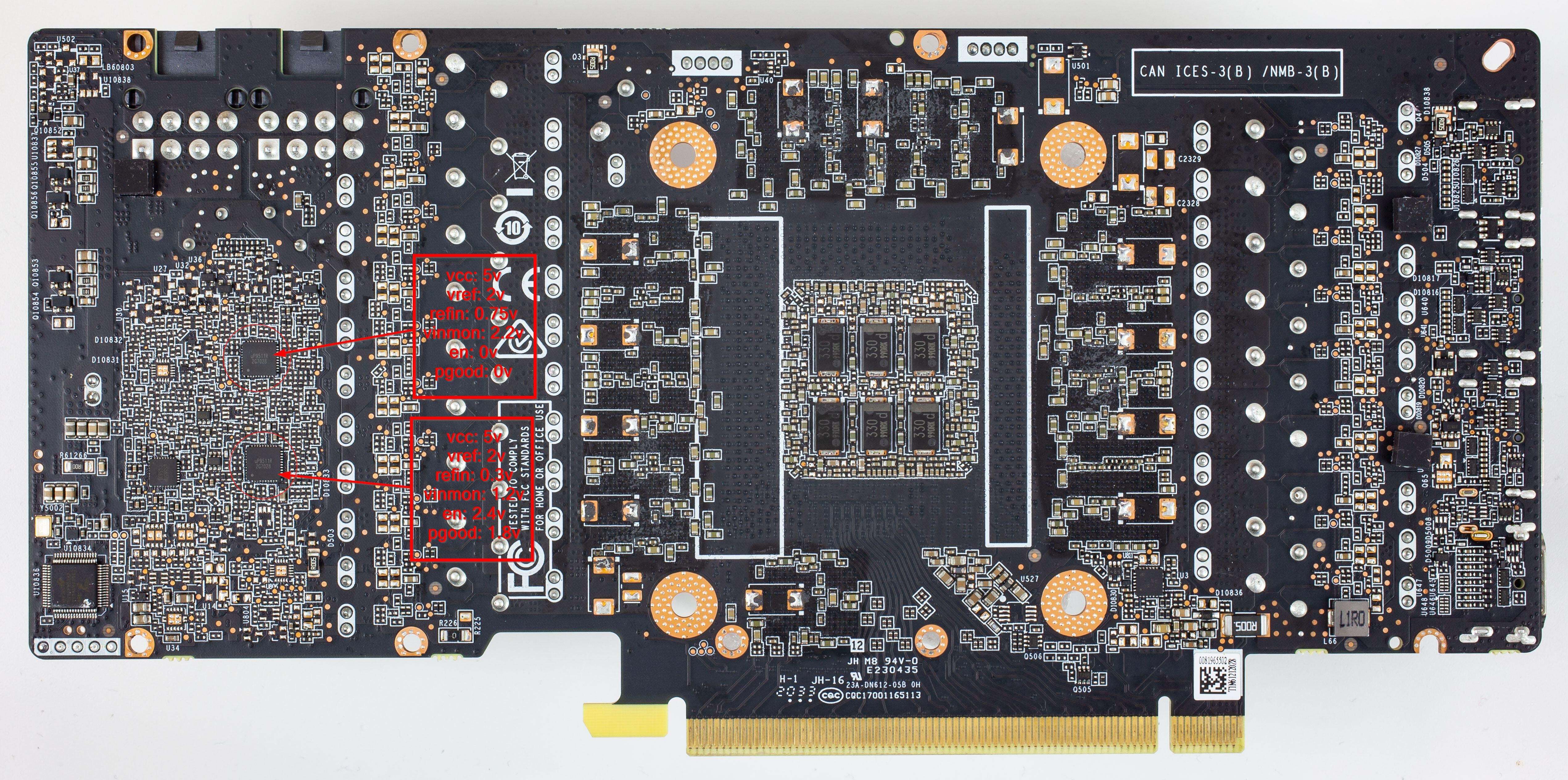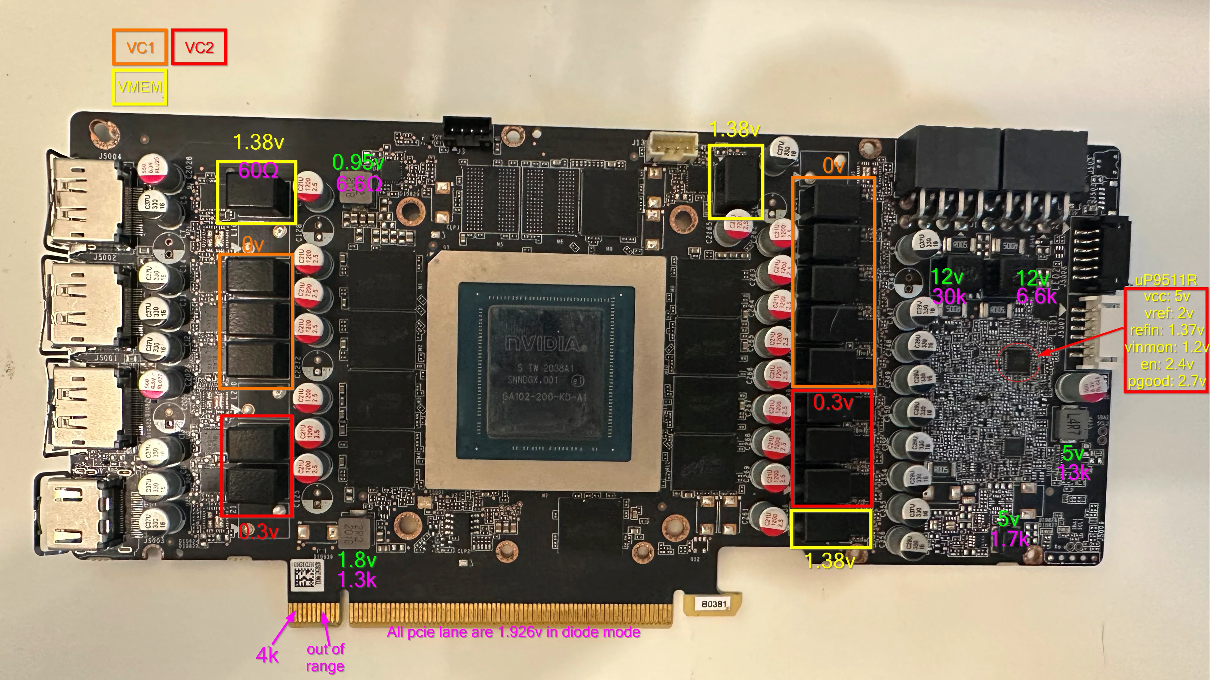 The card is a ZOTAC RTX 3080 Trinity OC 10GB. I can't find any schematics for this model, so it's a bit challenging for me to diagnose it with my limited knowledge.