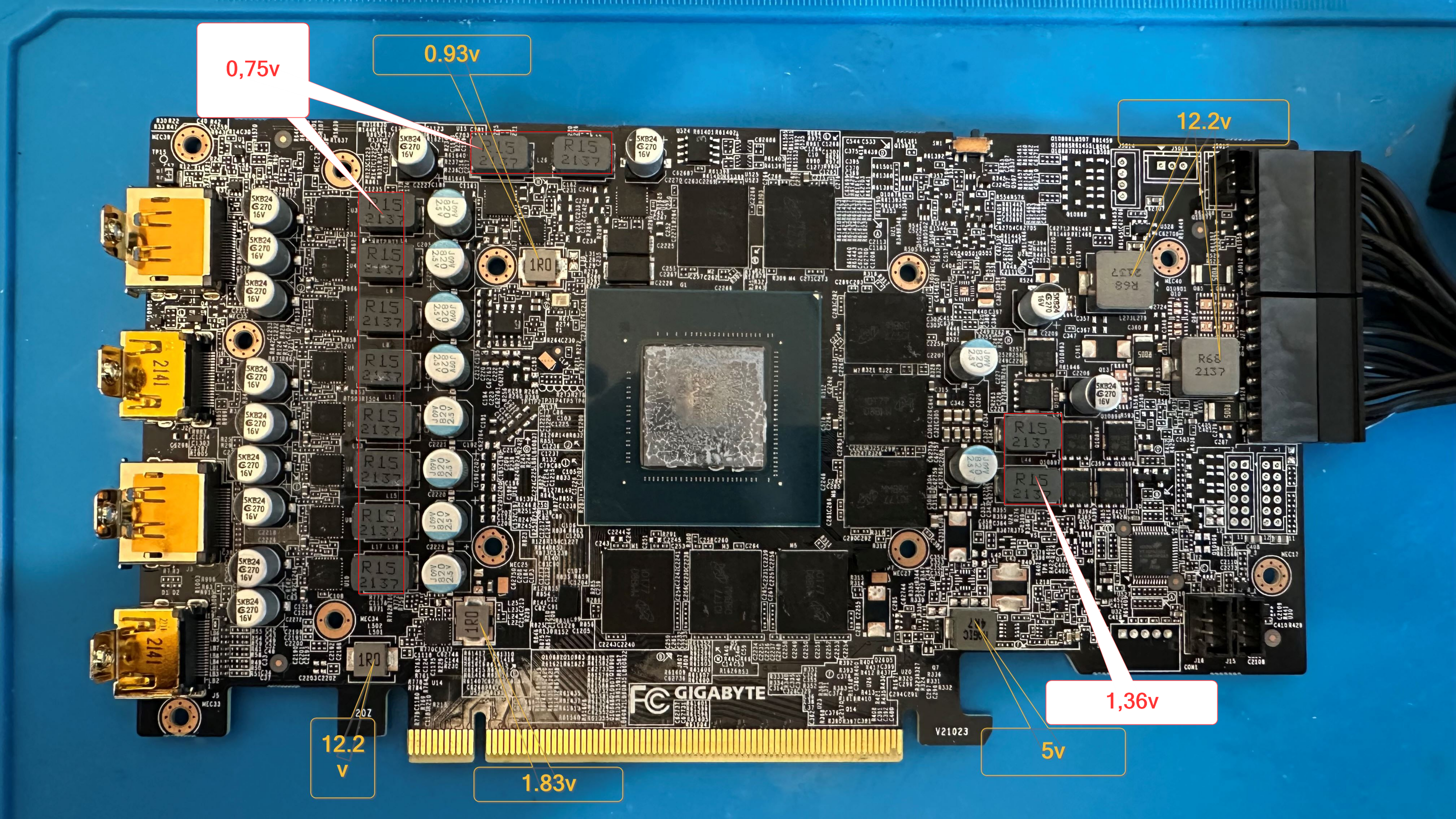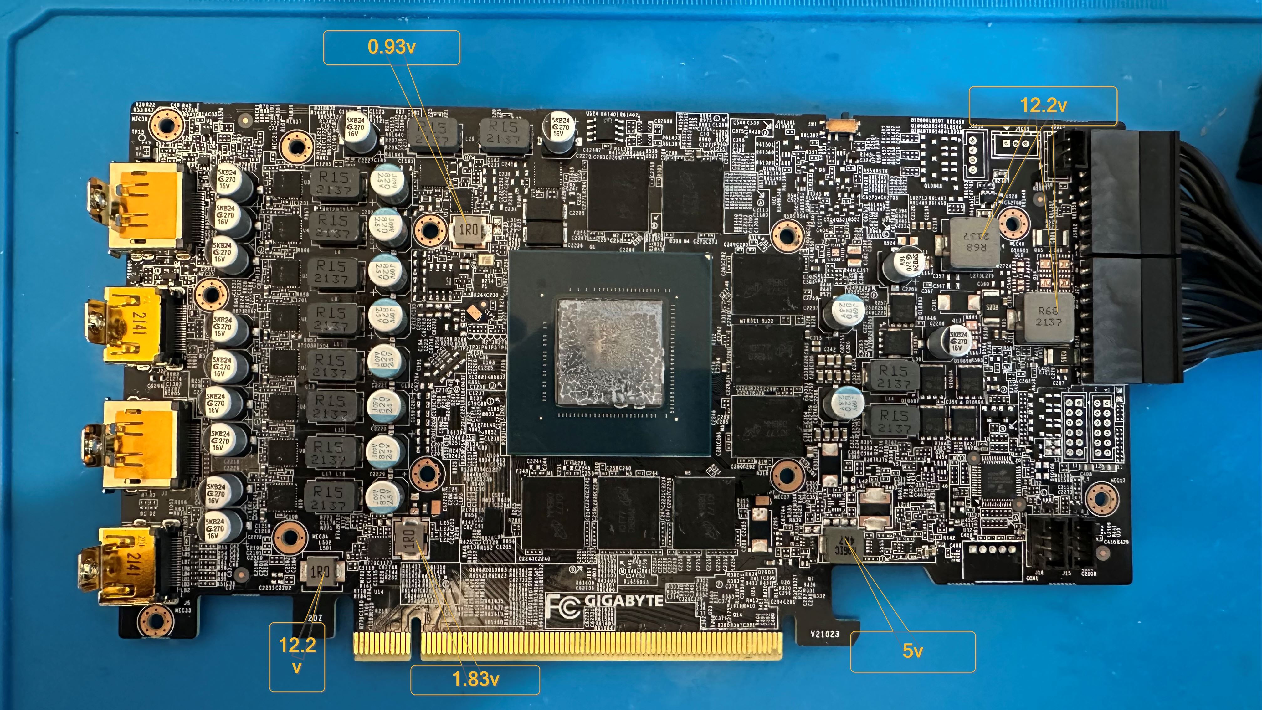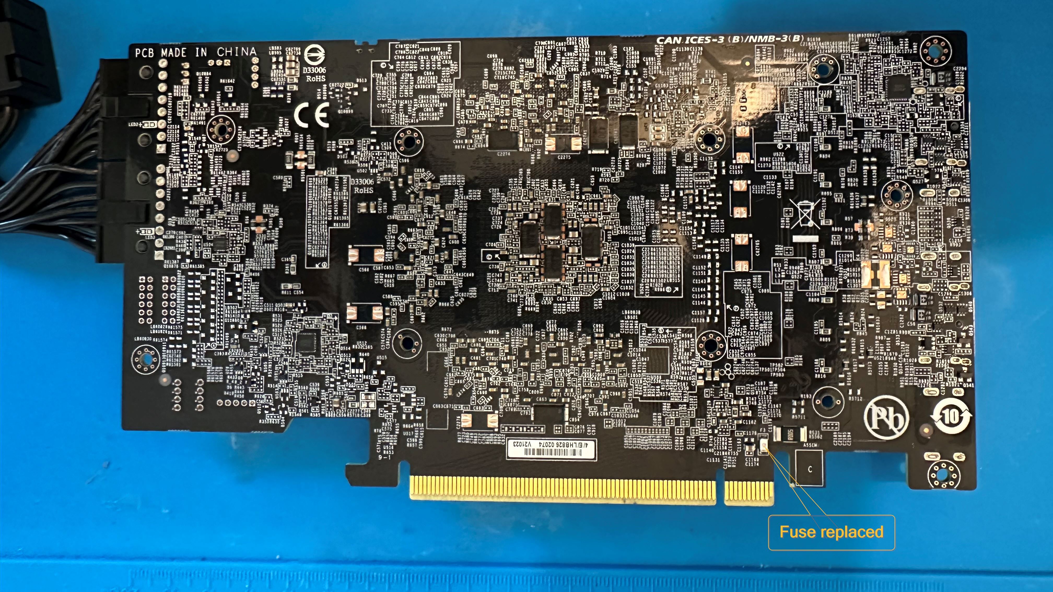During my inspection, I didn't spot any obvious physical damage. However, when testing, I discovered the PCIe 12V line was open. I replaced the blown fuse and rechecked the measurements—no short circuits on the main lines.