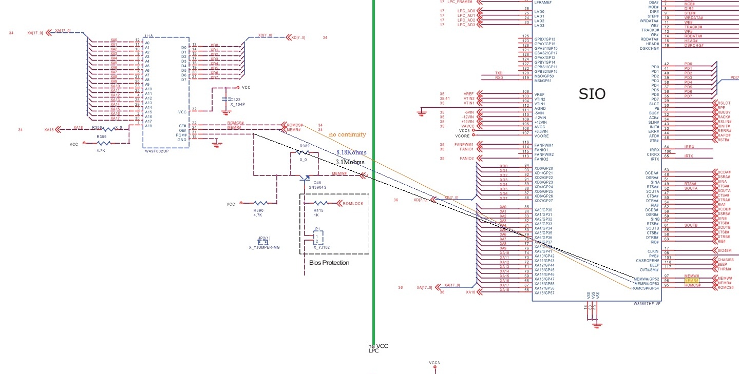 Am tempted to just run 3 jumpers from RN91 (located just under the CPU 4-pin socket) to VCC, ROMCS# and MEMR# in accordance with the schematic, and see what happens; but i think that it might destroy the BIOS.