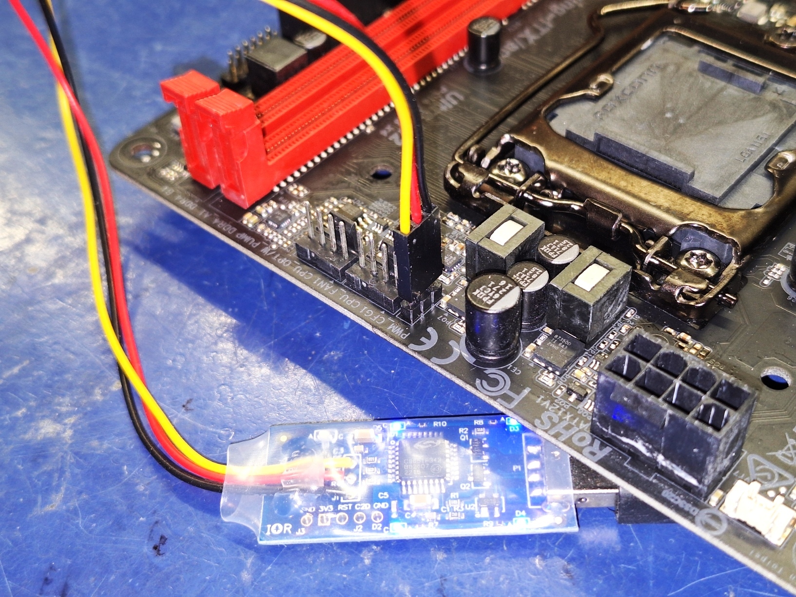 Here a picture how to connect the USB005 adapter to this board - normally where the 3 wire cable is connected there are only 3 solder joints (vias), but I have soldered a 3 pin header into the place, as this is easier than soldering a cable.