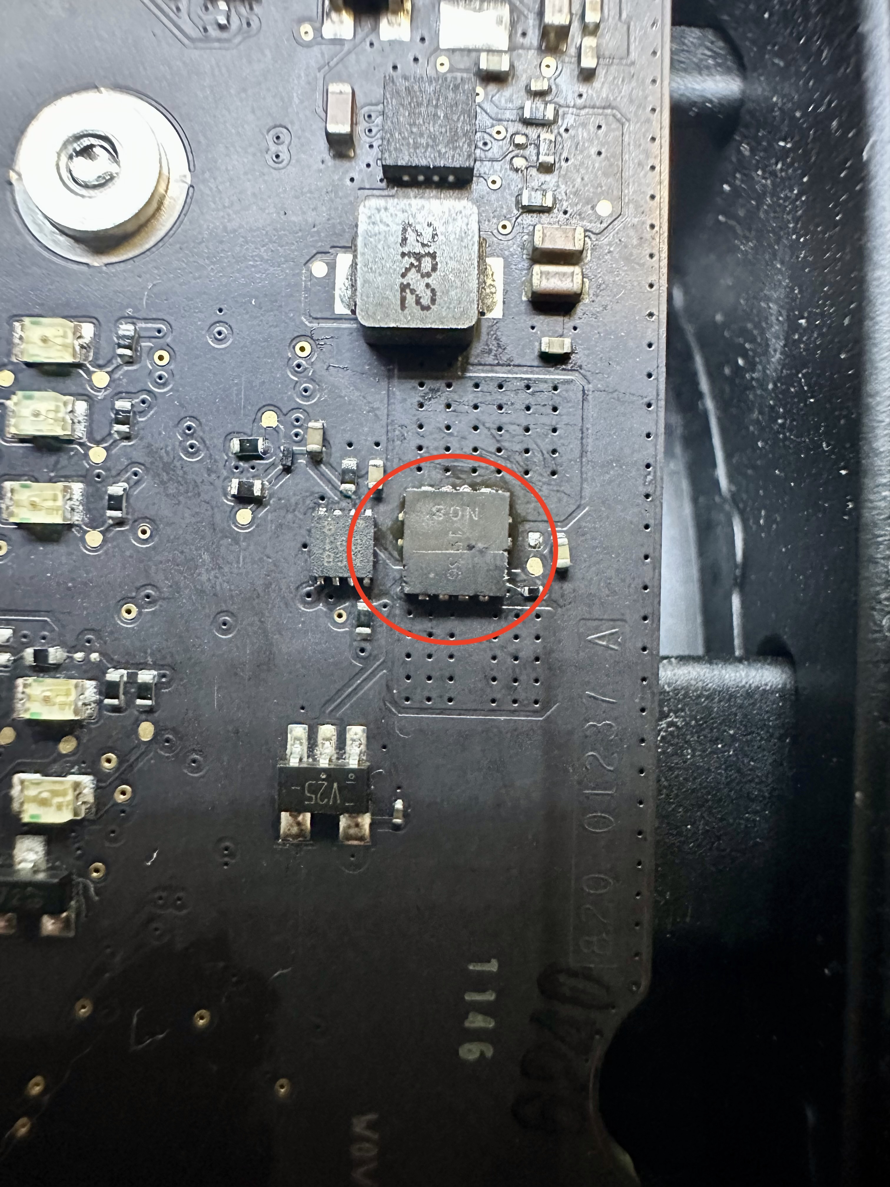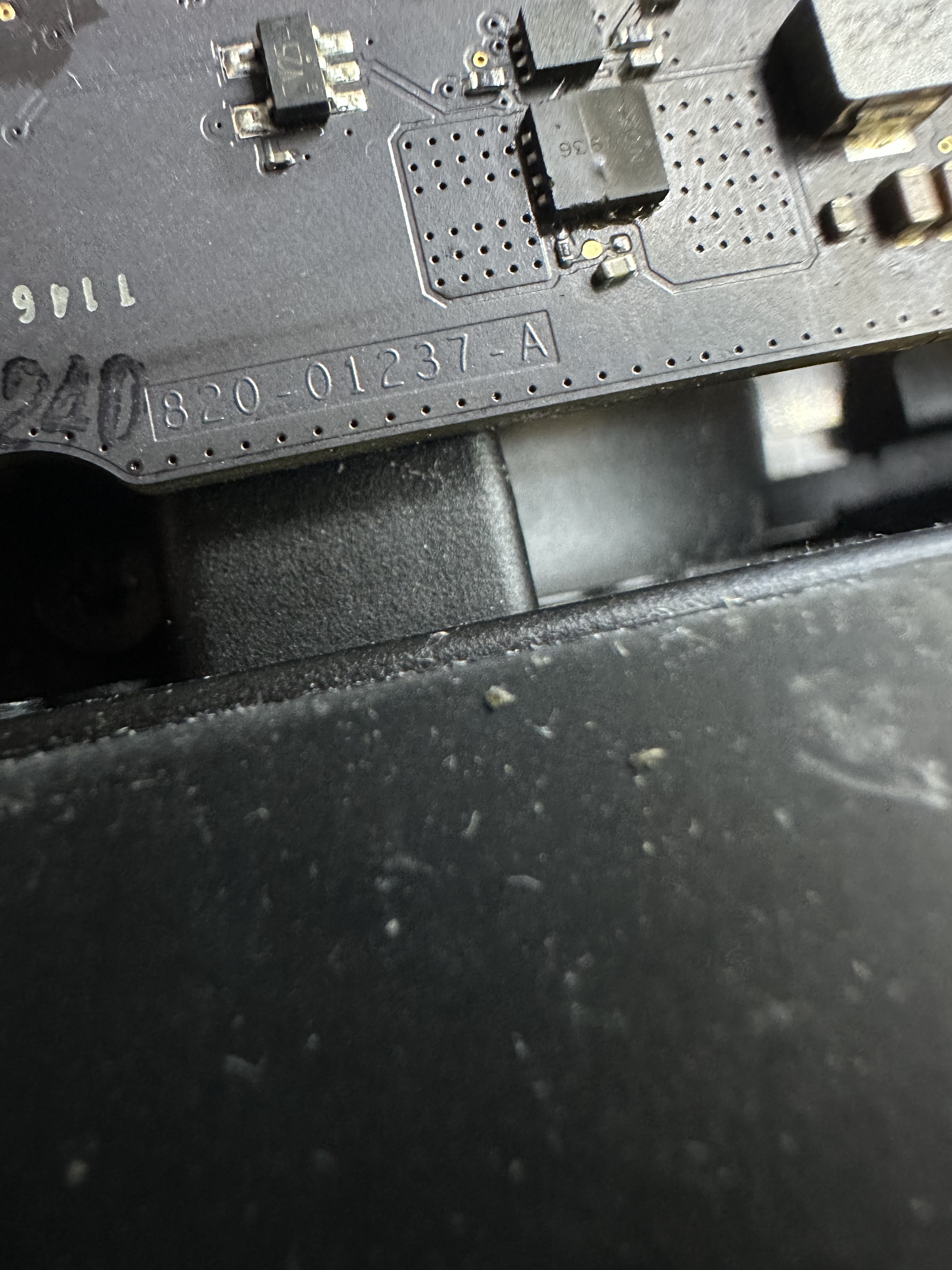 Charger sitting at 5v/0a. PPBUS is at 1.9v-0.9v steady cycle (peaks, drains, loops). Confirmed CHGR_EN_MVR is missing, but DCIN was reaching ISL just fine, so replaced ISL--no change at all. Confirmed pp3v8_aon is also missing--and being unsure *exactly* which signal appears first (or if they are simultaneous), I inspected PMU/U8100 area and found no shorts, but also found PP3V8_AON_MPMU_ISNS_VIN missing (not shorted). Replaced U8100 just in case (have had them fail in weird ways),... -