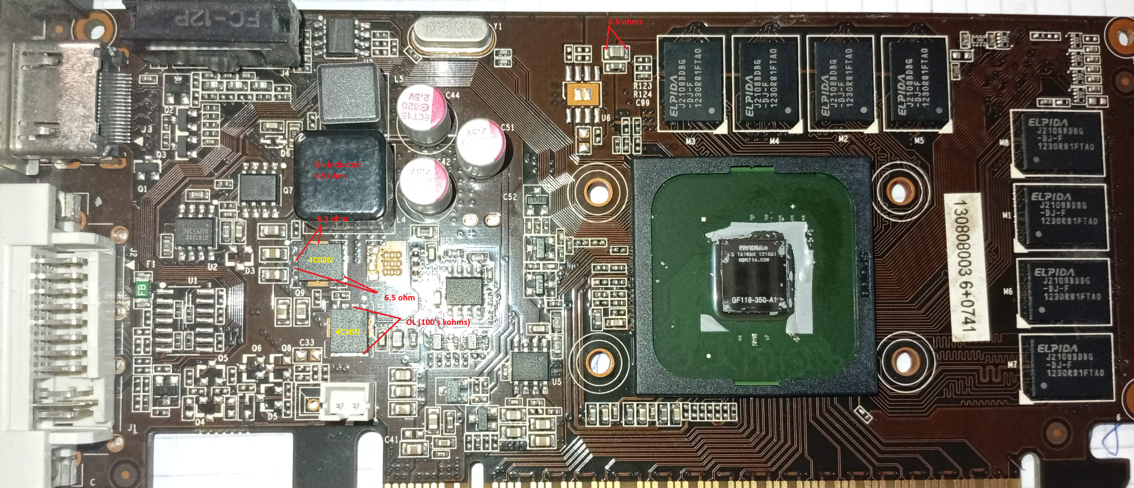 I have checked 12V and 3.3V on the PCIe lanes and they are not shorted, but I have measured 6.5 ohms on the big power supply inductor (measured against the metal ground). Measuring nearby N channel MOSFETS 4C08N and 4C10N, I have found that MOSFET 4C08N has resistance 6.6 ohms between source and drain.