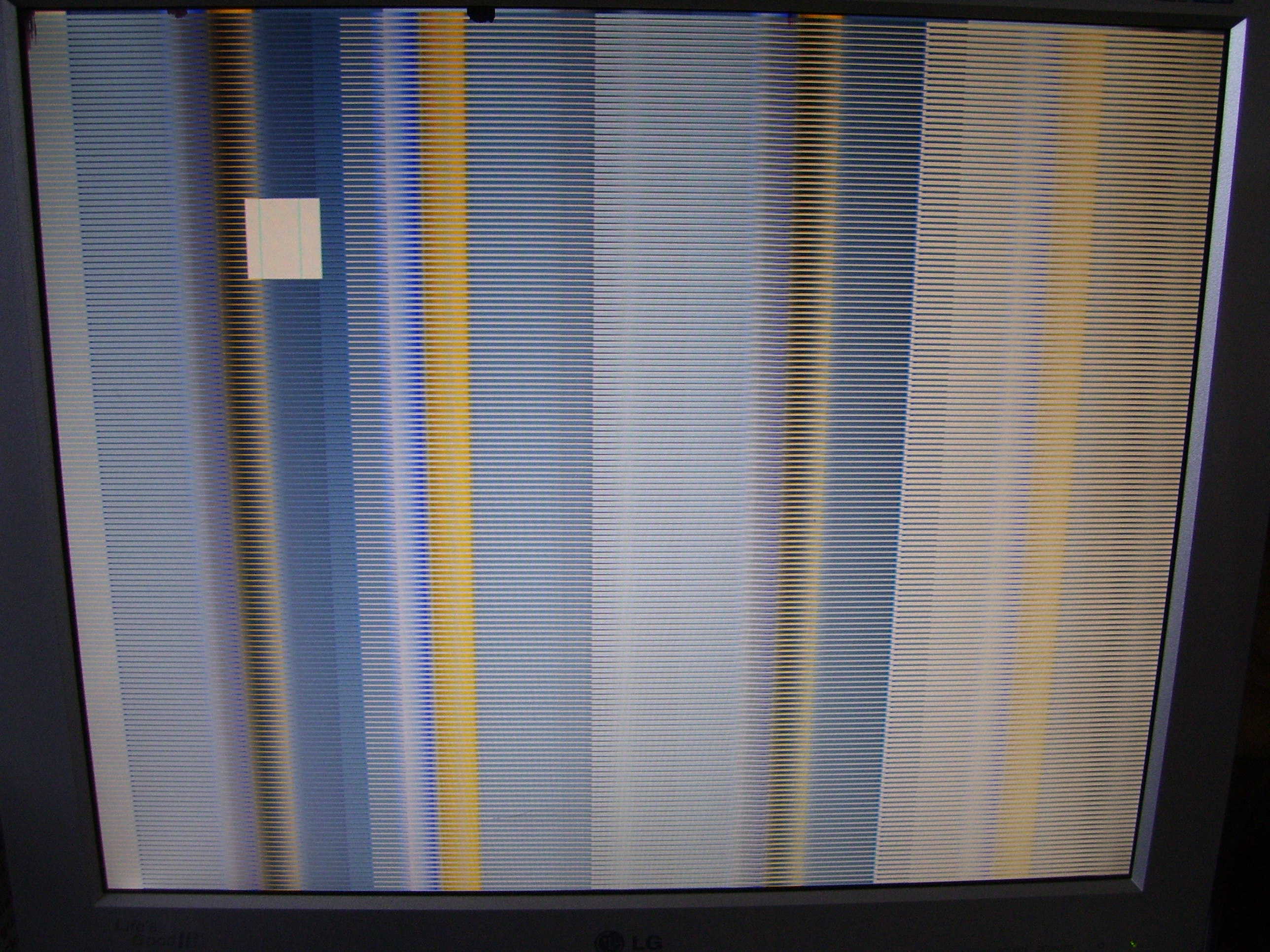 The image that appears on the screen is dependent upon what was showing on the screen beforehand - So the colours and number of vertical bands can be vary considerably, but there is always evenly-spaced horizontal lines through all of them.