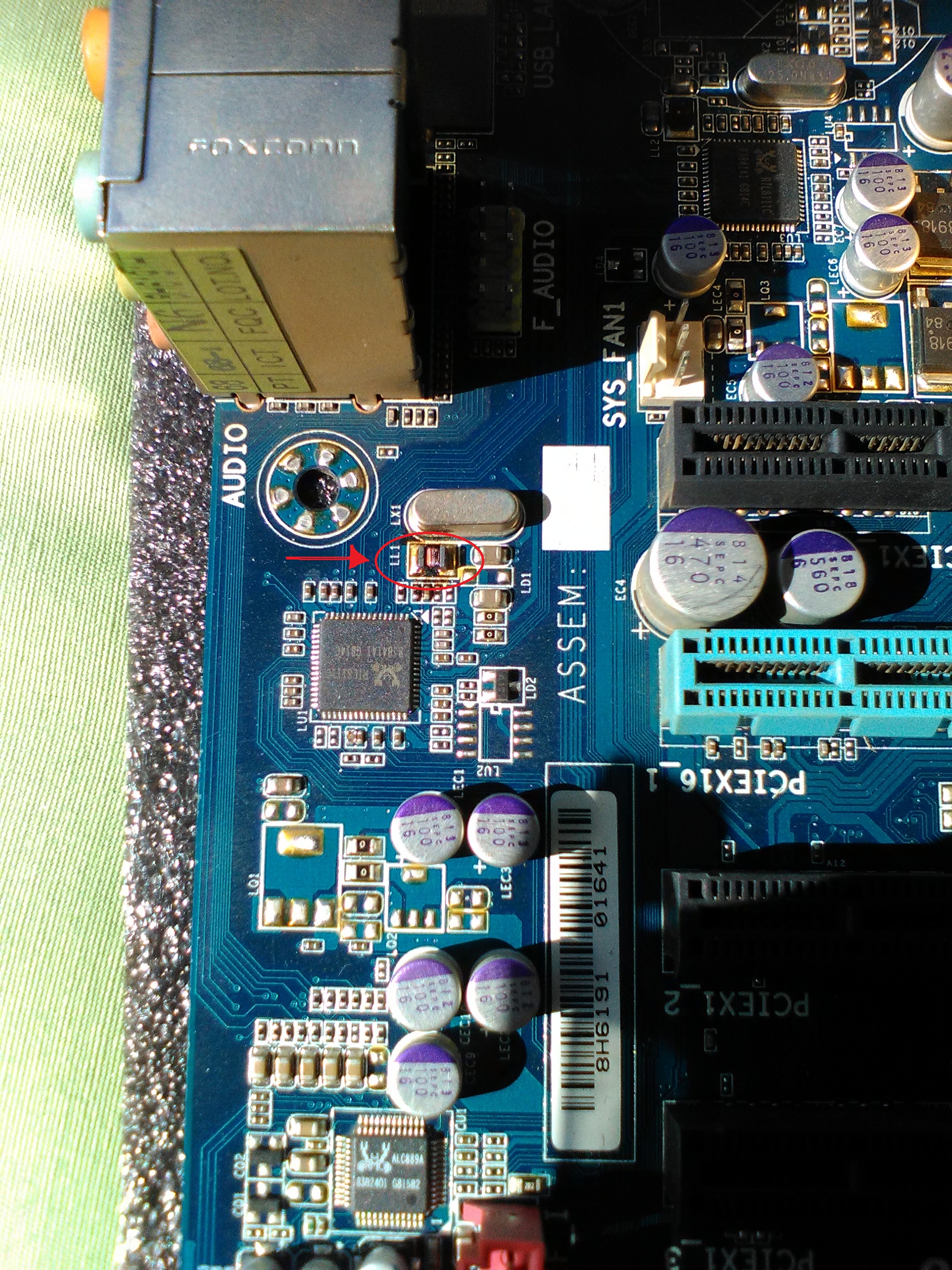 Right above your top PCI-E slot there is a similar circuit for your other Ethernet port, The chip is labeled RTL811IC (some generic Realtek Ethernet chip) same as the one on the circuit you are trying to repair, measure the resistance across the unburnt coil in that circuit to find the value of the coil you want to replace. The coil is labeled LL2 you want to replace LL1. Hope this helps.Hi kevin! thanks for the reply! What do you mean with "whatever the hell you, you put the same on the other ic" . replace the inductor with the same value of the other ethernet port? can you point this inductor on to foto i have post? if you have a schematic i will appreciate thatComment