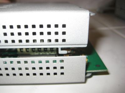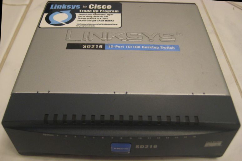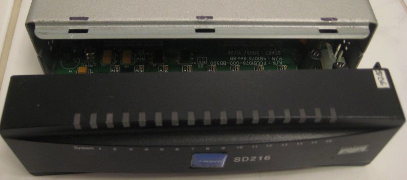 Out of 12 Cisco/Linksys SD216 10/100 16 ports Ethernet switches, 7 have now failed. I just got time to look at these. To open the box, first remove the front by depressing the 3 tabs on top of the plastic, then slide the top metal part of the housing to the back to disengage the four ‘L' hooks, see pictures.