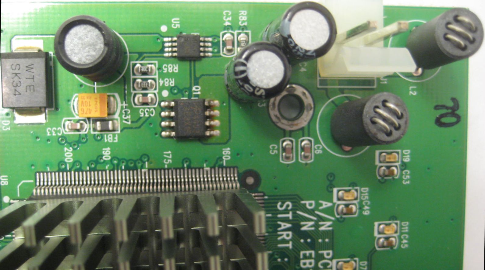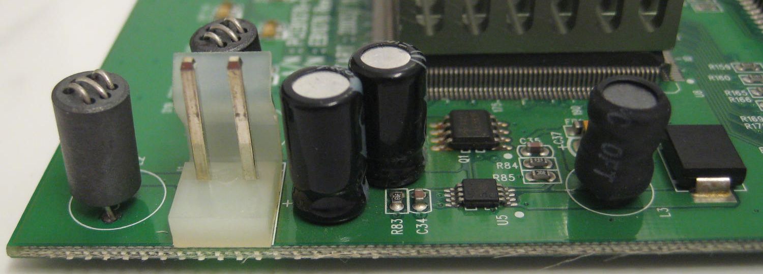 [A] 5 units [out of the 7] were ‘Rev. 1'; 4 had the same failure mode: with 12VDC applied, the PWR LED would light up, then all the LEDs would blink very fast at a very low power. I noticed that the 2 primary caps C3/C4 were very hot e.g. 80deg C. These caps are ‘STONE' 100micF 25V 105degC, and are connected to the power socket J1 wired to the input socket 12VDC. The remaining 1st stage of the power circuit converts 12VDc to 3.3VDC using an LM3485 buck controller U5, a 4403 MOSFET Q1 and a Shottky diode D3; schematic is straight out of the Texas Instruments LM3485 data sheet. The 3.3VDC is further converted to 1.81VDC for the 2 10/100 8 ports IC's hidden by the large heatsinks. I replaced the 2 caps by a single 330micF 25VDC, and all is OK –for now- The removed caps measured 18, 19, 38 & 41micF.
