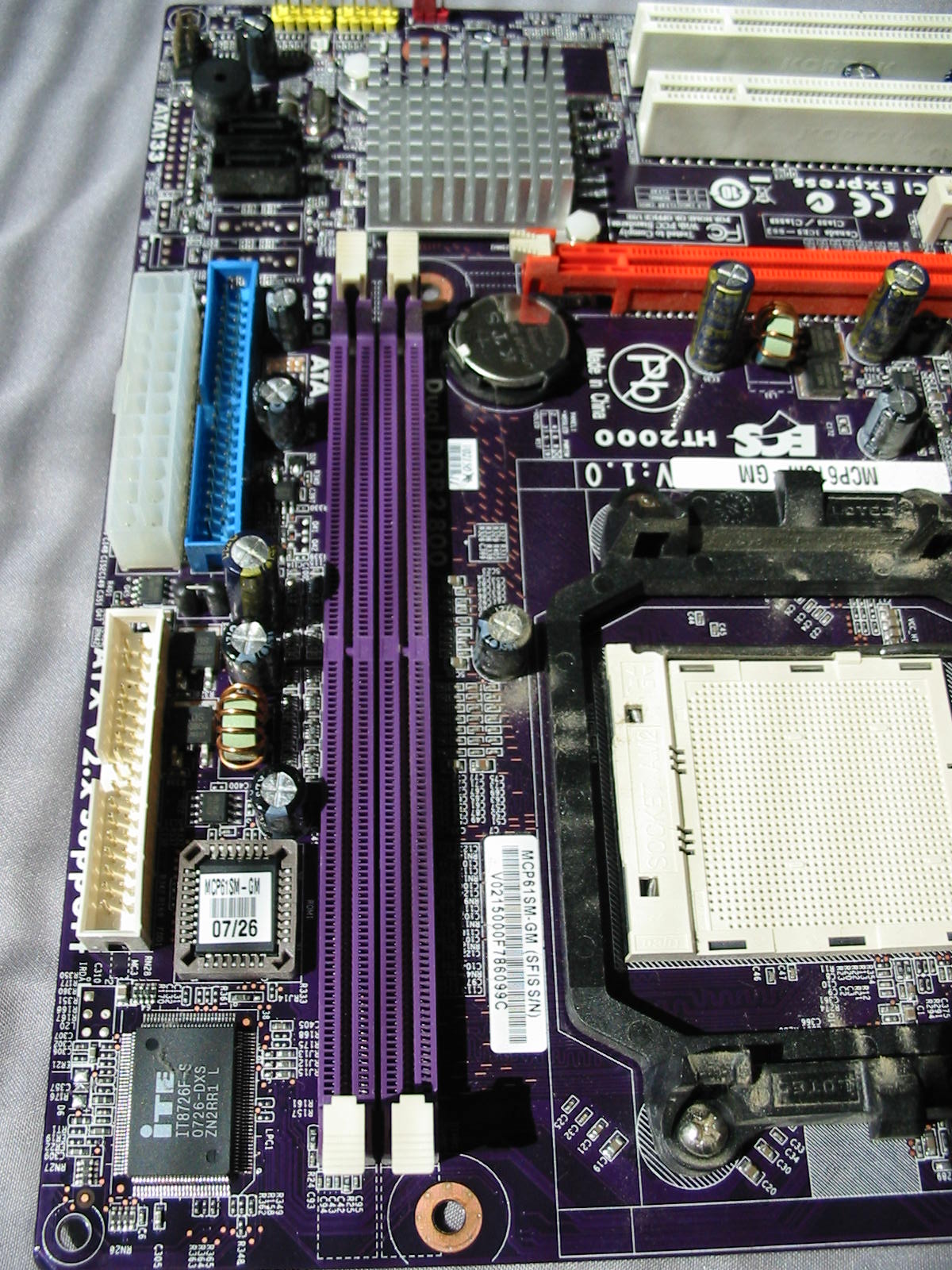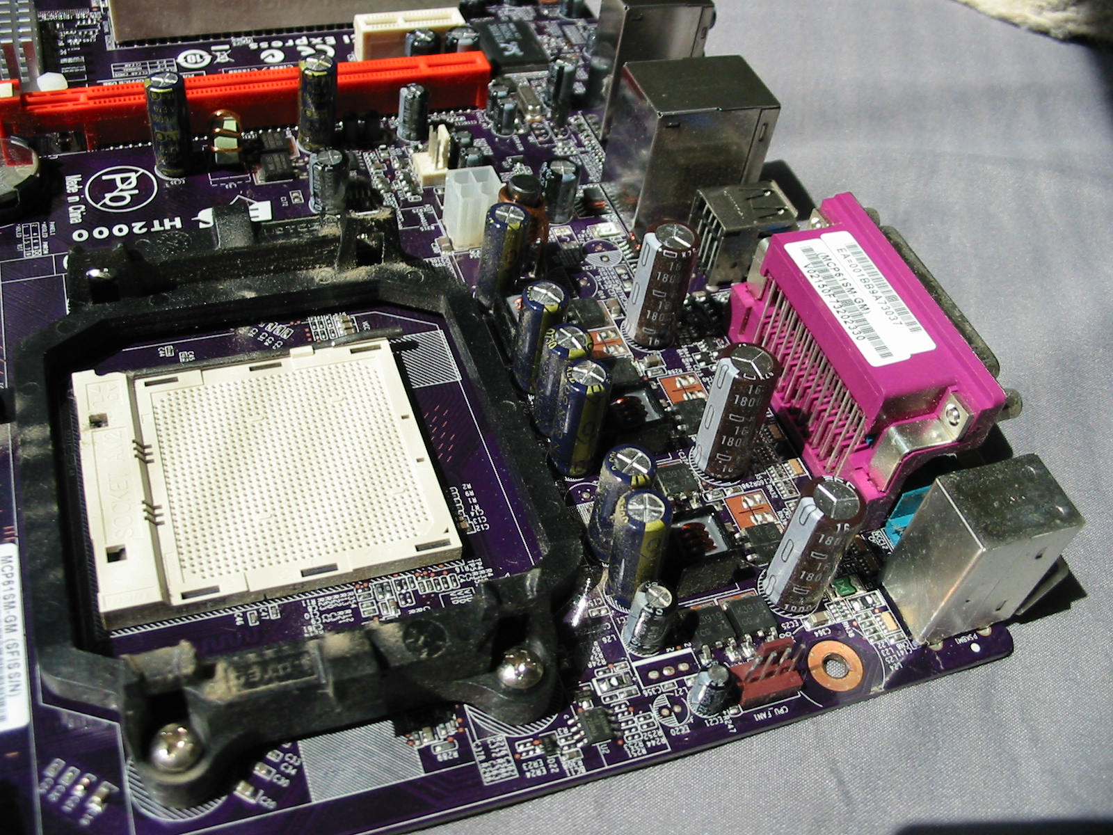 The eMachines, on the other hand, came with this ECS MCP61SM-GM ver1.0 motherboard that had bad OST RLZ caps on every buck-regulated rail. This is what it looked like when I got it: