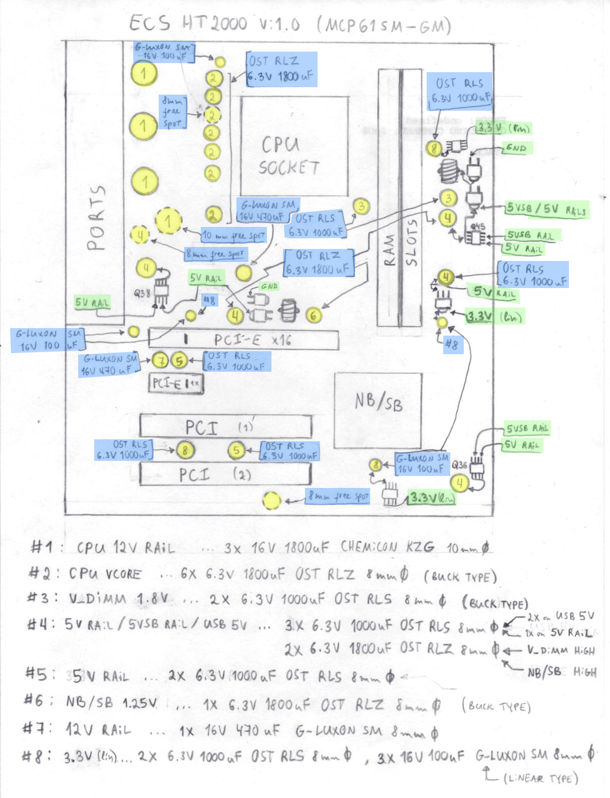 I know there are quite a few threads on this one. Badcaps.net store even has a capacitor kit for it. But as usual, I do my recaps in a rather less-than-standard way, so I figured I could post the results here anyways. Worth noting is that I always make a “cap map”, so if you are doing one of these motherboards and get lost where each cap went, this could help you figure it out.