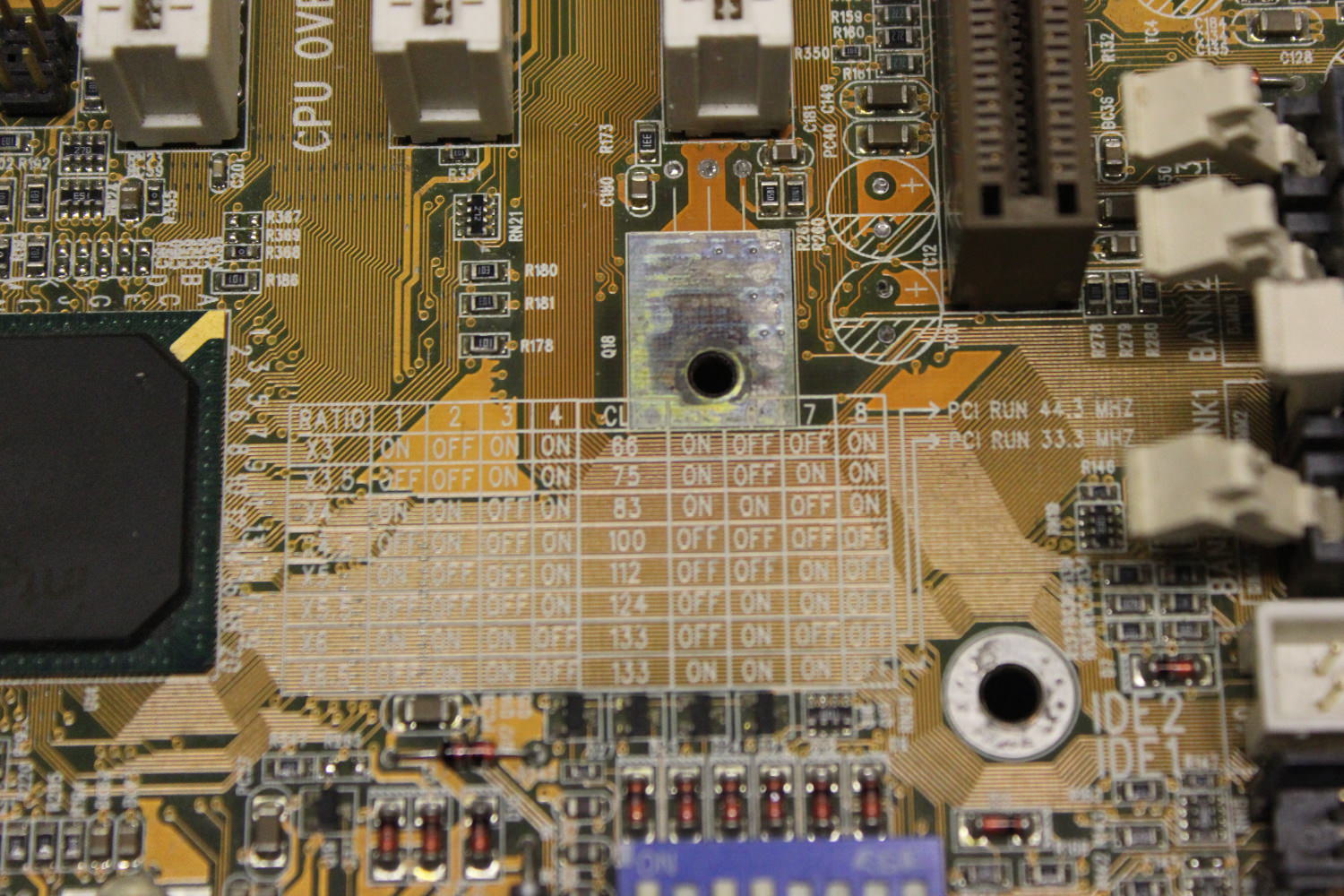 I noticed the capacitors near the voltage regulator in the center (LINFINITY LX8383A - 00CP PHIL 9935C), (datasheet) were bulged, and the bottom of the PCB right under the voltage regulator looks discolored. So maybe this means the LX8383A is bad too? or this discoloration maybe was caused by the bad caps nearby?
