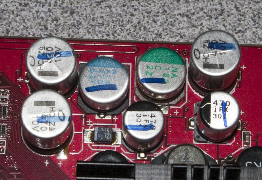 I've recapped many motherboards, power supplies and monitors, but never a video card. I don't recognize the brand of caps on the card. Are they a known bad type and would it be worthwhile trying to replace them. The caps just have labels of "HC Z", "NA", "A31E" etc, with a size. Most of them appear to be 470uF.