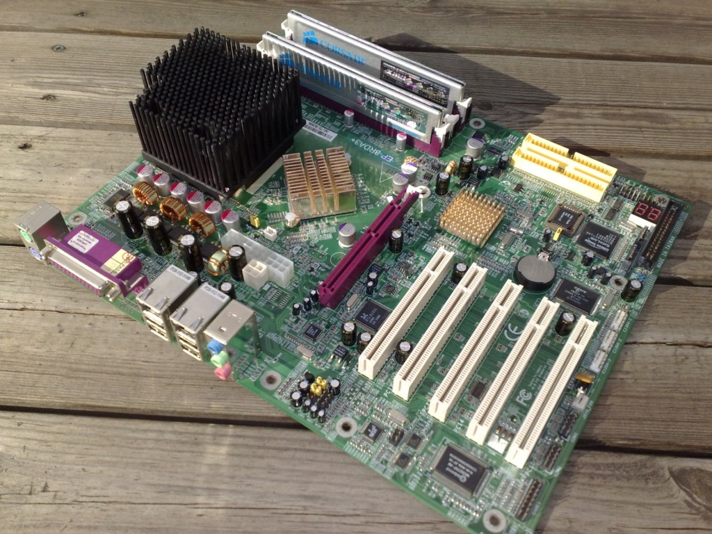 This one was gifted to me some years ago by user Pentium 4, along with a few other goodies. It actually came in working order with no bulging or leaking caps. However, I noted there were United Chemicon KZG caps everywhere on the motherboard. The CPU VRM output (CPU V_core) was the only exception: it had only 2x KZG. The rest was 6x UCC TMV 4V 680 uF caps… which aren’t any good news either.