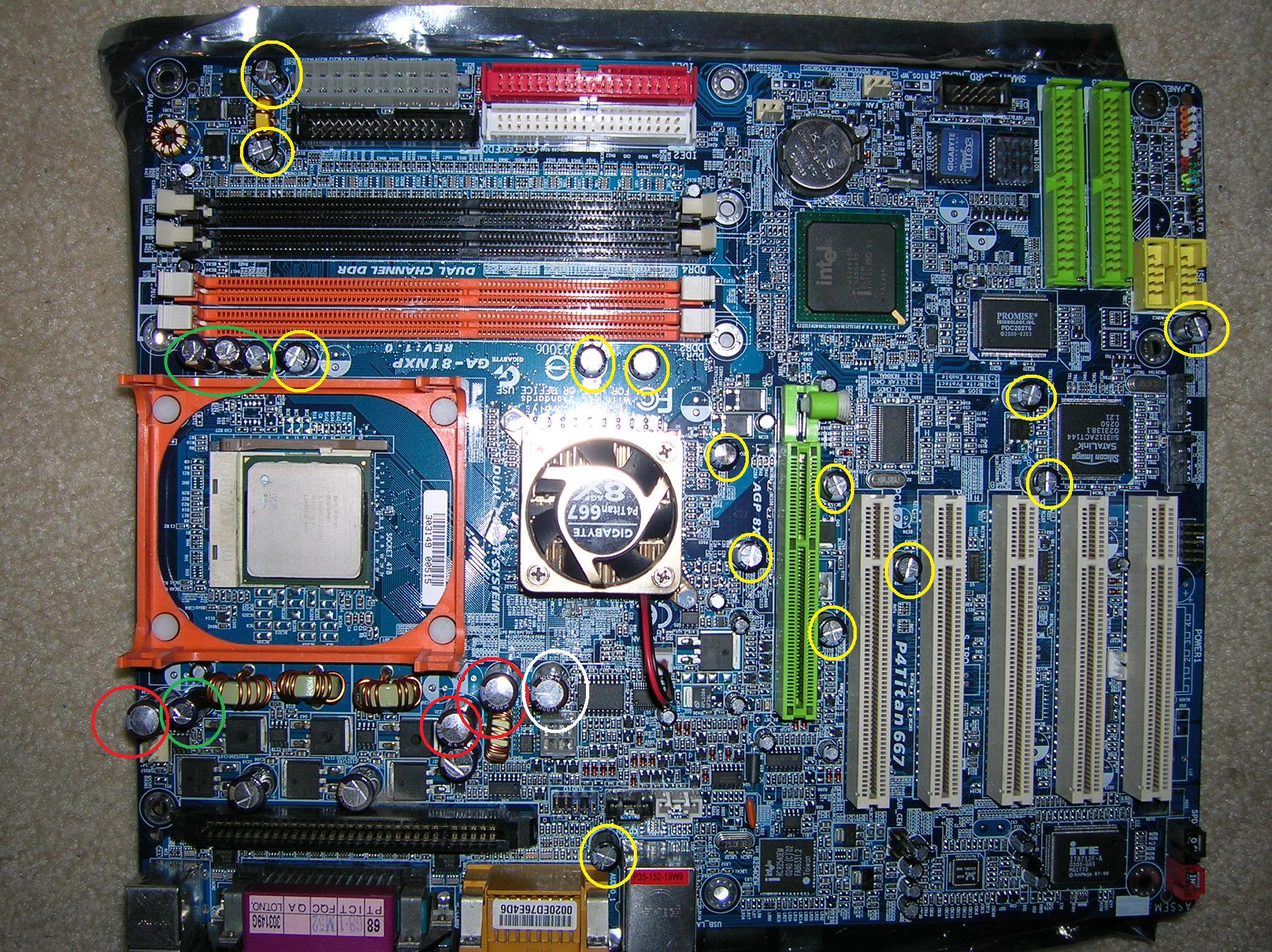 Hey guys, I've got a Gigabyte GA-8INXP board. It failed a while ago slowly starting locking up. Finally one day I reset it and it wouldn't post. If I turn it off and back on enough times it will finally post and load windows then just hard lock. But once I completely remove power from PSU it starts all over. Have to power cycle a bunch of times until it'll post. I just recently learned about the "bad capacitor" ordeal. So I looked over the board and for sure can identify 2 capacitors leaking from the top. I'm not sure what brand they are *boards still mounted in case*.