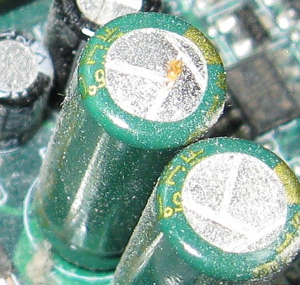 I've attached two close-up photos that show the capacitor that has the small brown (electrolyte) spot and very slight upward bulge at its vent. The bulge is hard to see clearly because it's so slight... the photo shot from the side is the better view. The photo shot from above is the better view of the brown spot. I believe the zillion tiny white particles are dust motes, not leaked electrolyte.