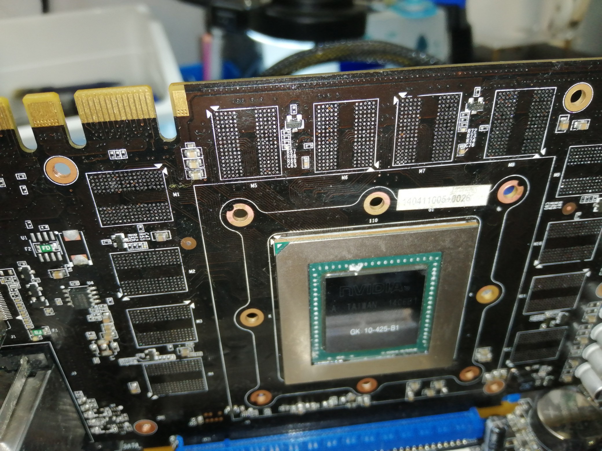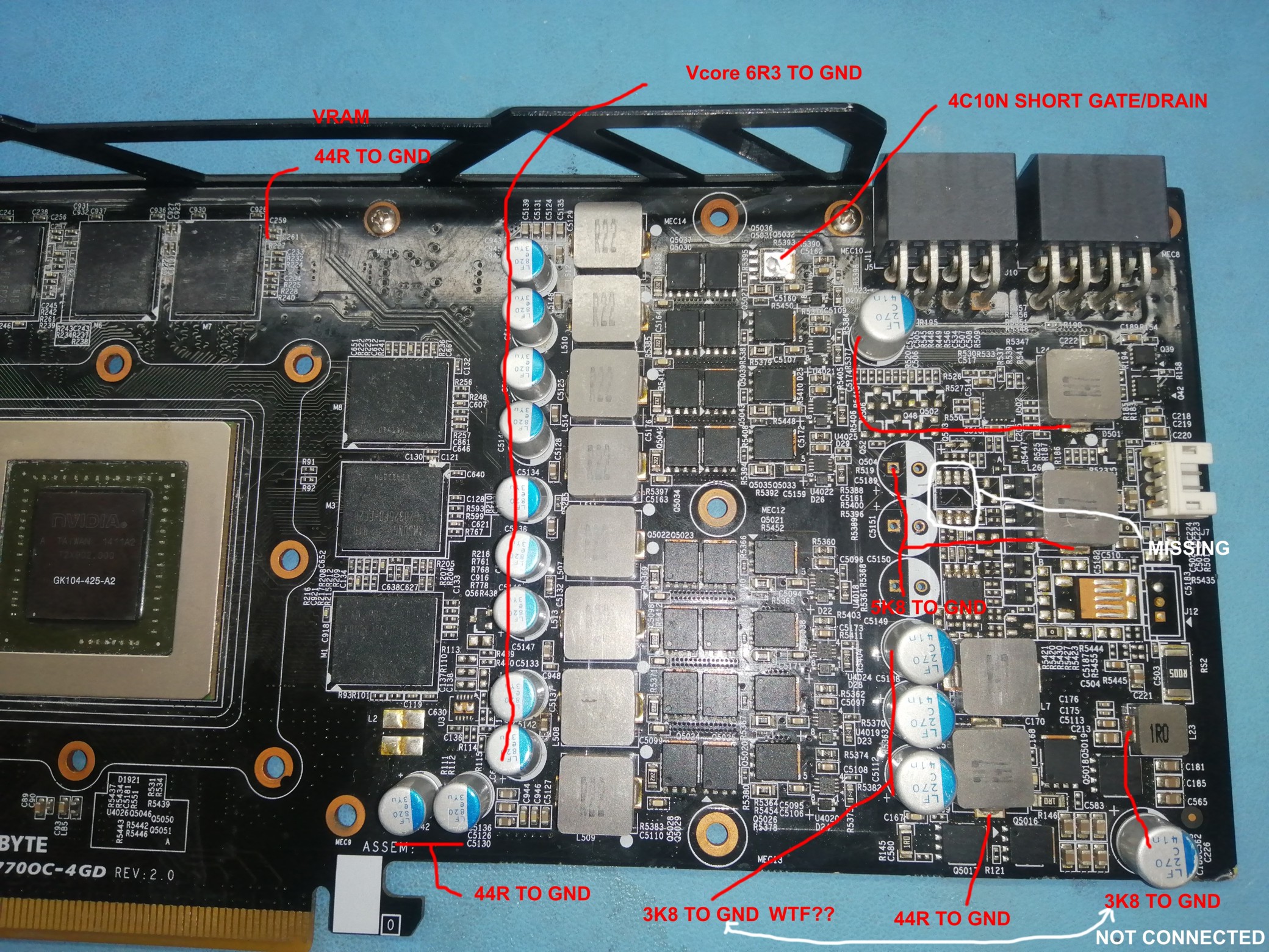 I took some resistance measurements, Vcore is 6R3 and Vram is 44R - which looks kinda OK compared to the other cards, considering this one has 16 RAM chips, 8 each side and the GTX780 cards had 12 RAM chips and read 110R