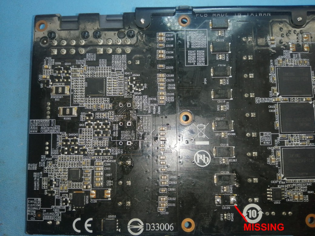OK so i replaced the six missing SMD capacitors by taking them from the Palit. I also made a note of the values.