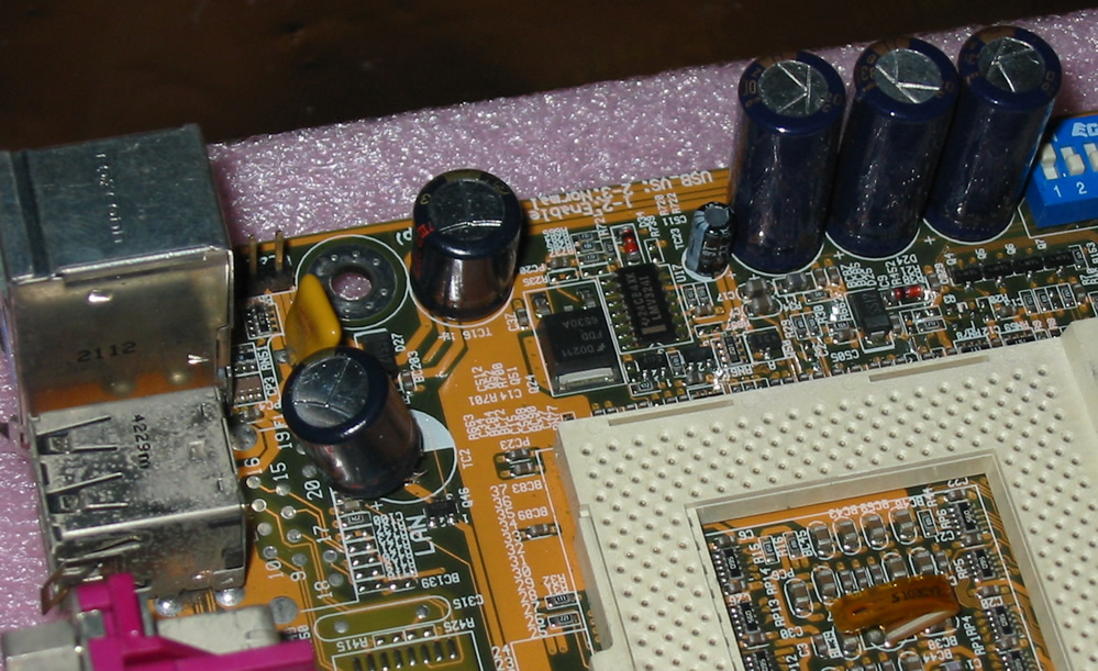 Now I know why those 3 caps were bulged on my board (apart from them being crap) - the CPU VRM runs very hot (with Tualatin Celeron 1.3GHz) as there are only 2 mosfets. Replaced green GSCs with Nichicons 1200uF/16V and black GSCs with KOME 1000uF/16V.